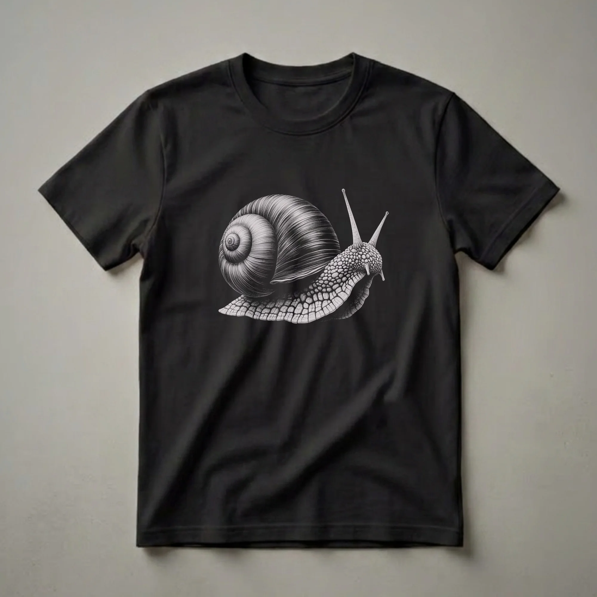 Garden snail enthusiasts will appreciate the intricate detail of this striking graphic tee, featuring a meticulously rendered illustration of a Helix aspersa. This snail drawing captures the creature in profile, showcasing the textured spiral of its shell and the segmented appearance of its foot and head. Snails, known for their slow and steady pace, are fascinating gastropod mollusks found in diverse habitats worldwide, from damp gardens to forests. This shirt is a thoughtful gift for anyone who admires the natural world, particularly those drawn to the quiet beauty of invertebrates. It's a unique piece of apparel that stands out, making it a go-to tee for nature walks, casual outings, or simply relaxing at home while appreciating the wonders of the outdoors. Wear this t-shirt to express your connection to the earth and its smaller inhabitants, celebrating the intricate designs found in nature. This eye-catching design is sure to spark conversations among fellow nature lovers and entomology aficionados.