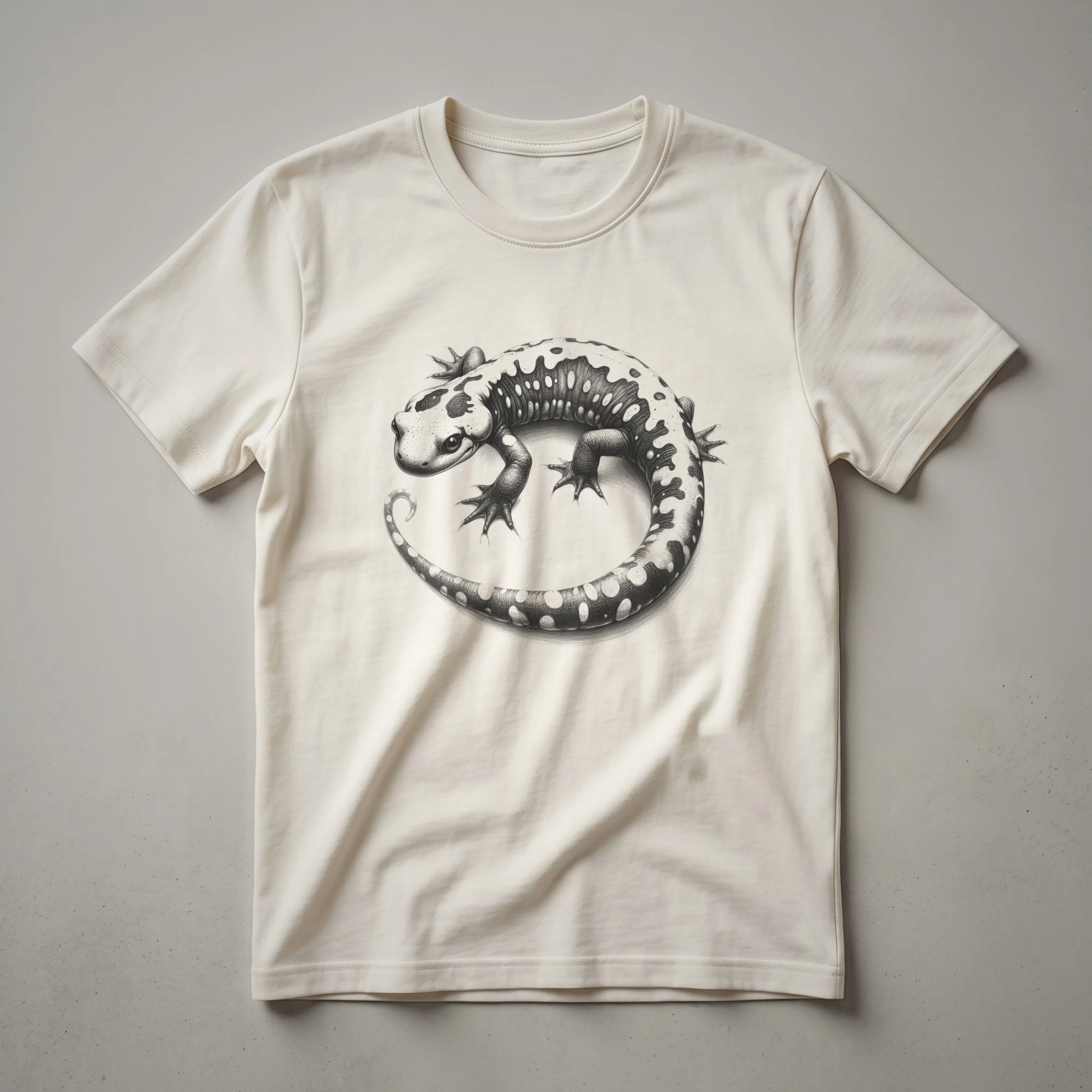 Reptile enthusiasts and admirers of unique wildlife art will appreciate this striking t-shirt featuring a detailed vintage drawing of a spotted salamander. The artwork showcases the amphibian curled into a circular shape, highlighting its distinctive markings and textured skin with intricate linework. Spotted salamanders, known for their dark bodies adorned with irregular yellow or cream spots, are native to eastern North America. They typically inhabit moist woodlands, often found under logs, rocks, or leaf litter near ephemeral or permanent water sources where they breed. This graphic tee is a thoughtful gift for anyone fascinated by amphibians, herpetology, or the natural world. It makes a thoughtful conversation starter for nature walks, casual outings, or while attending wildlife conventions. This shirt is a staple for any nature lover's wardrobe, offering a blend of artistic flair and scientific appreciation for these fascinating creatures. Wear it to your next hike or nature photography session.