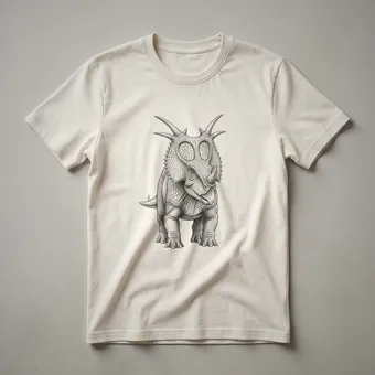 Paleontology enthusiasts and dinosaur lovers will appreciate this striking graphic tee featuring a vintage-style line drawing of a Styracosaurus. This herbivorous ceratopsian dinosaur, known for its distinctive frill and prominent nasal horn, roamed North America during the Late Cretaceous period, approximately 75 to 73 million years ago. The intricate linework captures the textured scales and formidable horns of this ancient creature, making it a standout piece for any wardrobe. This shirt is a thoughtful gift for anyone fascinated by the Mesozoic era or who enjoys unique, artistic apparel. It's a go-to tee for casual outings, museum visits, or simply expressing a passion for natural history. Wear this t-shirt to your next fossil dig or to a dinosaur-themed event and spark conversations about these magnificent beasts. The detailed artwork makes this more than just a shirt; it's a wearable piece of prehistoric art that appeals to both young and old fans of dinosaurs.