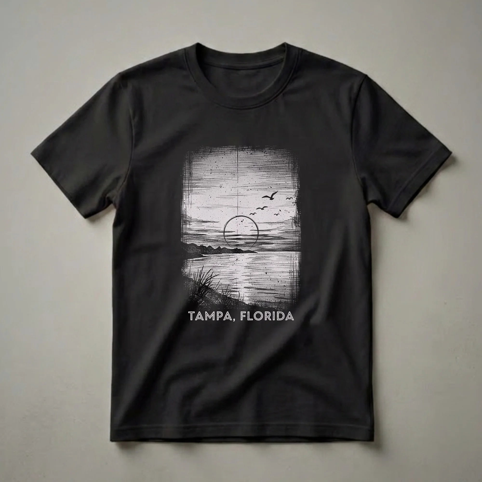Tampa, Florida residents and visitors alike will appreciate this vintage-style graphic tee featuring a serene coastal sunset. The drawing depicts a tranquil scene with silhouetted hills along the coastline, a calm body of water reflecting the sky, and several birds in flight against a textured sky. A circular motif, reminiscent of a setting sun or a target, is centered in the horizon. The distressed, hand-drawn aesthetic evokes a sense of nostalgia and adventure. This shirt is a perfect way for anyone who loves Tampa to showcase their connection to the city. It makes a thoughtful gift for friends and family who have visited or call Florida home. Wear this t-shirt to remember your travels or to celebrate your hometown pride. The graphic tee is a staple for any casual wardrobe, well suited for exploring the city or relaxing by the water. This Tampa, Florida shirt is a unique piece of apparel for those who cherish the Sunshine State's coastal beauty.