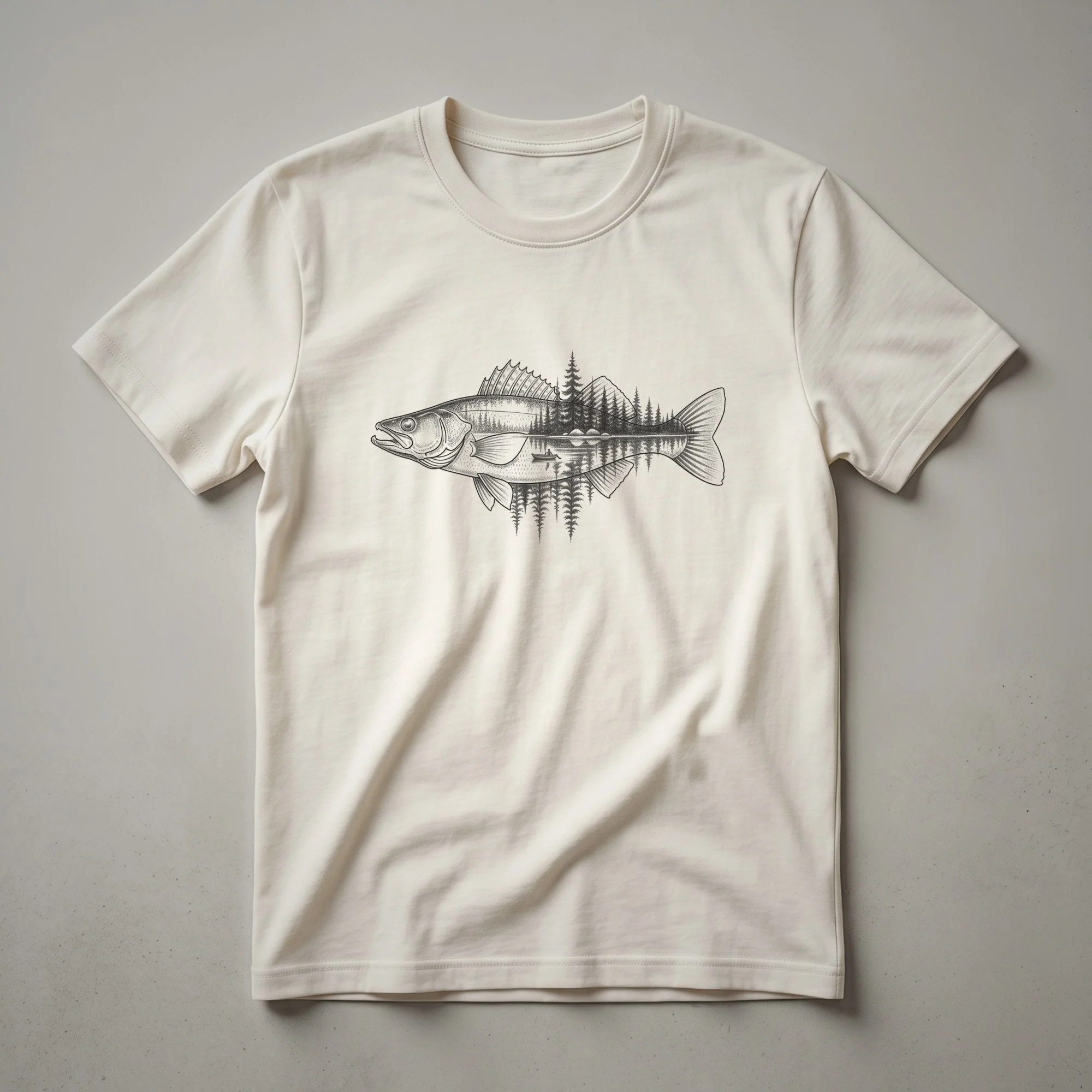 Walleye anglers who appreciate the tranquility of the outdoors will reach for this unique graphic tee. The design features a detailed line drawing of a walleye, its body artfully filled with a serene landscape. Within the fish's silhouette, you can see a calm lake reflecting a dense forest of pine trees, with a small boat and a lone angler casting a line. This imagery evokes the peaceful solitude often found on the water during a fishing expedition. Walleye, known for their predatory nature and prized by sport fishermen, are often found in large, deep lakes and rivers across North America, particularly in the northern United States and Canada. This shirt is a thoughtful gift for the fisherman in your life who understands the connection between the catch and the environment. It’s a staple in the collection for anyone who enjoys a day out on the water, whether they are casting for walleye or simply soaking in the natural beauty. Wear this t-shirt on your next fishing trip, to a casual gathering with fellow outdoorsmen, or simply as a reminder of your favorite pastime.