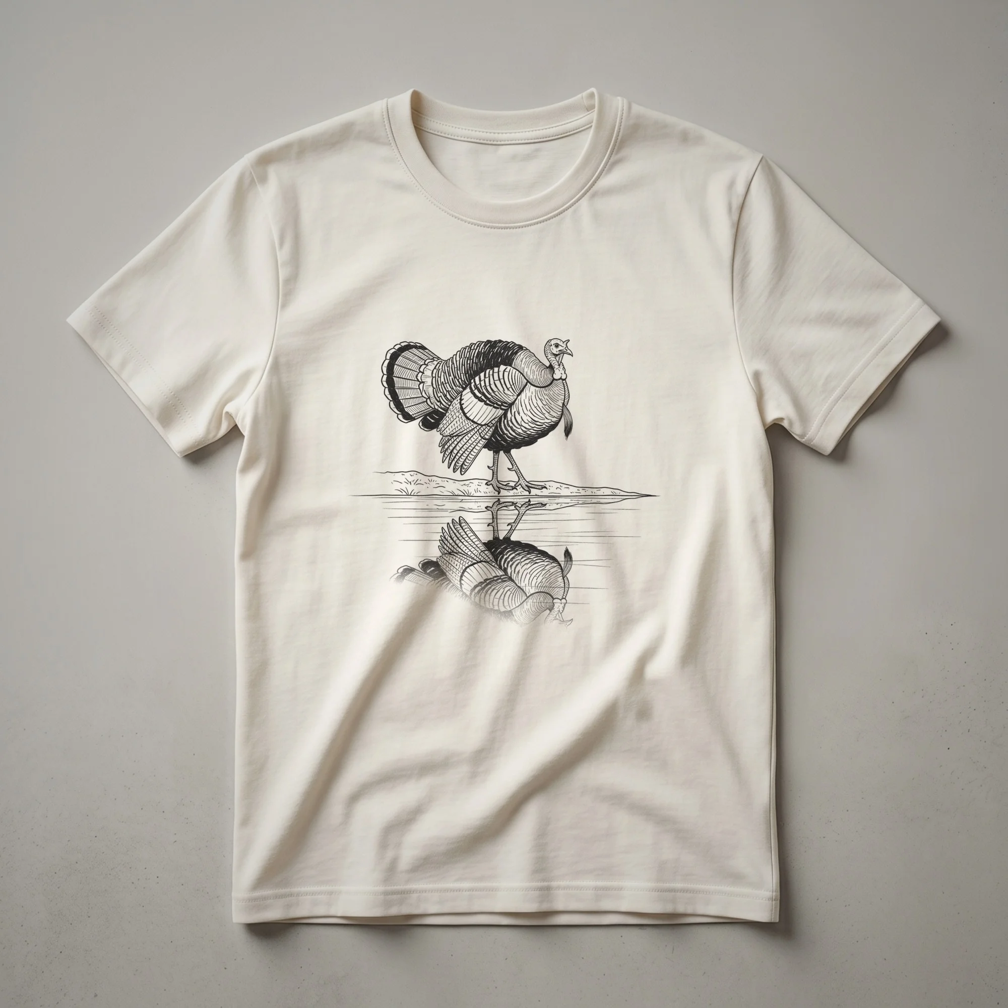 Wild turkey enthusiasts will appreciate this striking graphic tee featuring a detailed vintage drawing of a wild turkey. The artwork depicts a majestic turkey standing on a grassy bank, its reflection perfectly mirrored in the calm water below. This design captures the essence of these fascinating birds, known for their intelligence and adaptability. Wild turkeys, native to North America, inhabit a variety of environments, from forests to grasslands, and are a symbol of the continent's natural heritage. This shirt is a thoughtful gift for birdwatchers, hunters, or anyone who admires the beauty of wildlife. It's a go-to tee for those who enjoy the outdoors and want to wear their passion. This t-shirt works well for casual outings, hiking trips, or simply relaxing at home while celebrating your connection to nature. The intricate linework of the drawing adds a touch of rustic charm, making it a unique piece of apparel for any nature lover's wardrobe. Wear it to your next outdoor adventure or family gathering to spark conversations about the great outdoors.
