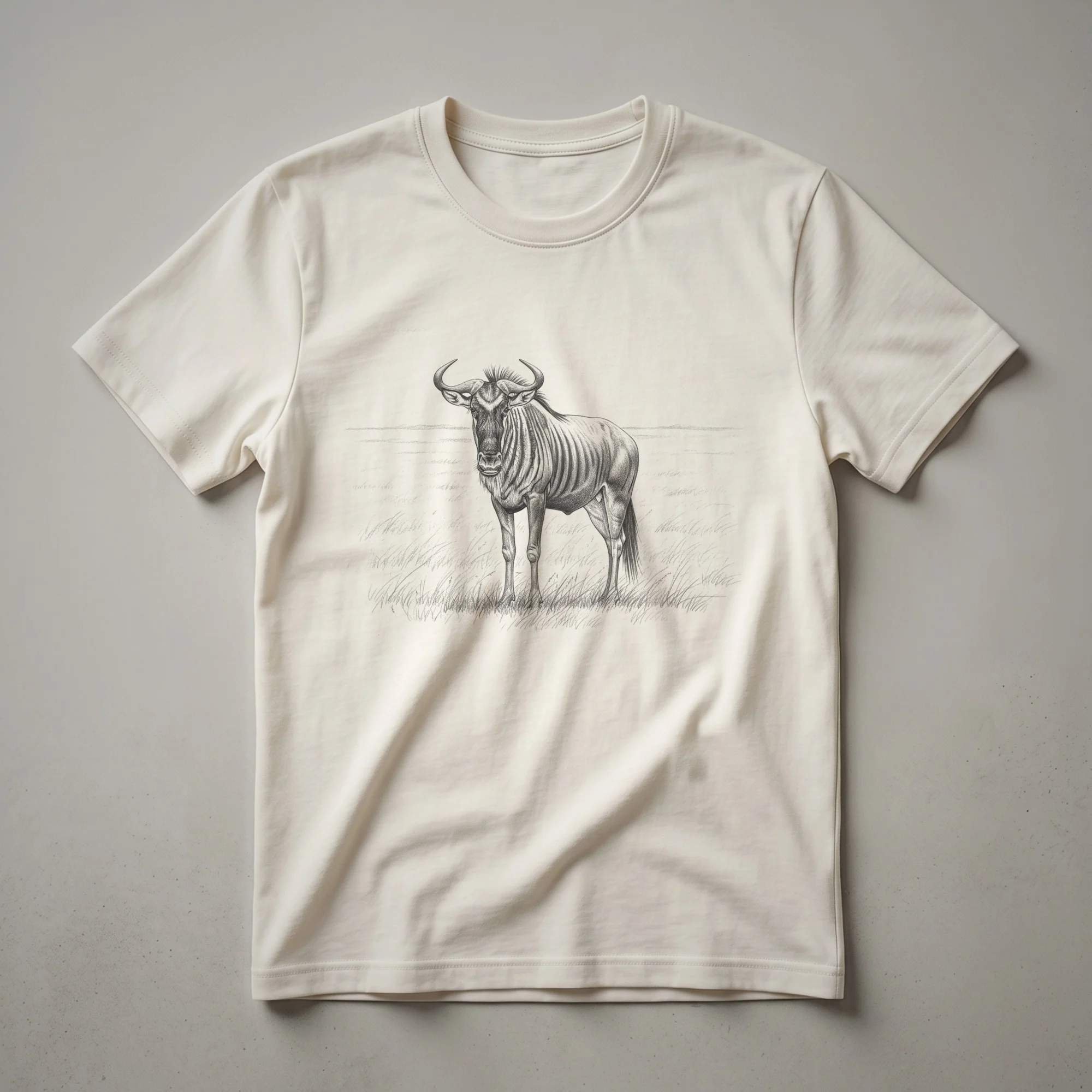 Wildlife enthusiasts and hikers will appreciate this striking t-shirt featuring a detailed line drawing of a wildebeest. The art style evokes a vintage feel, showcasing the animal's distinctive horns, muscular build, and striped pattern. Wildebeest, also known as gnus, are native to eastern and southern Africa, where they are famous for their massive migratory herds across the Serengeti. This tee works well for anyone who admires the raw beauty of the African savanna and its iconic inhabitants. It makes a thoughtful gift for a friend who dreams of safari adventures or enjoys nature photography. Wear this shirt on your next outdoor excursion, to a wildlife documentary screening, or simply as a conversation starter about your passion for the natural world. This graphic tee is a unique way to express your connection to the wild. This apparel is a go-to tee for anyone with a deep appreciation for zoology and conservation efforts.