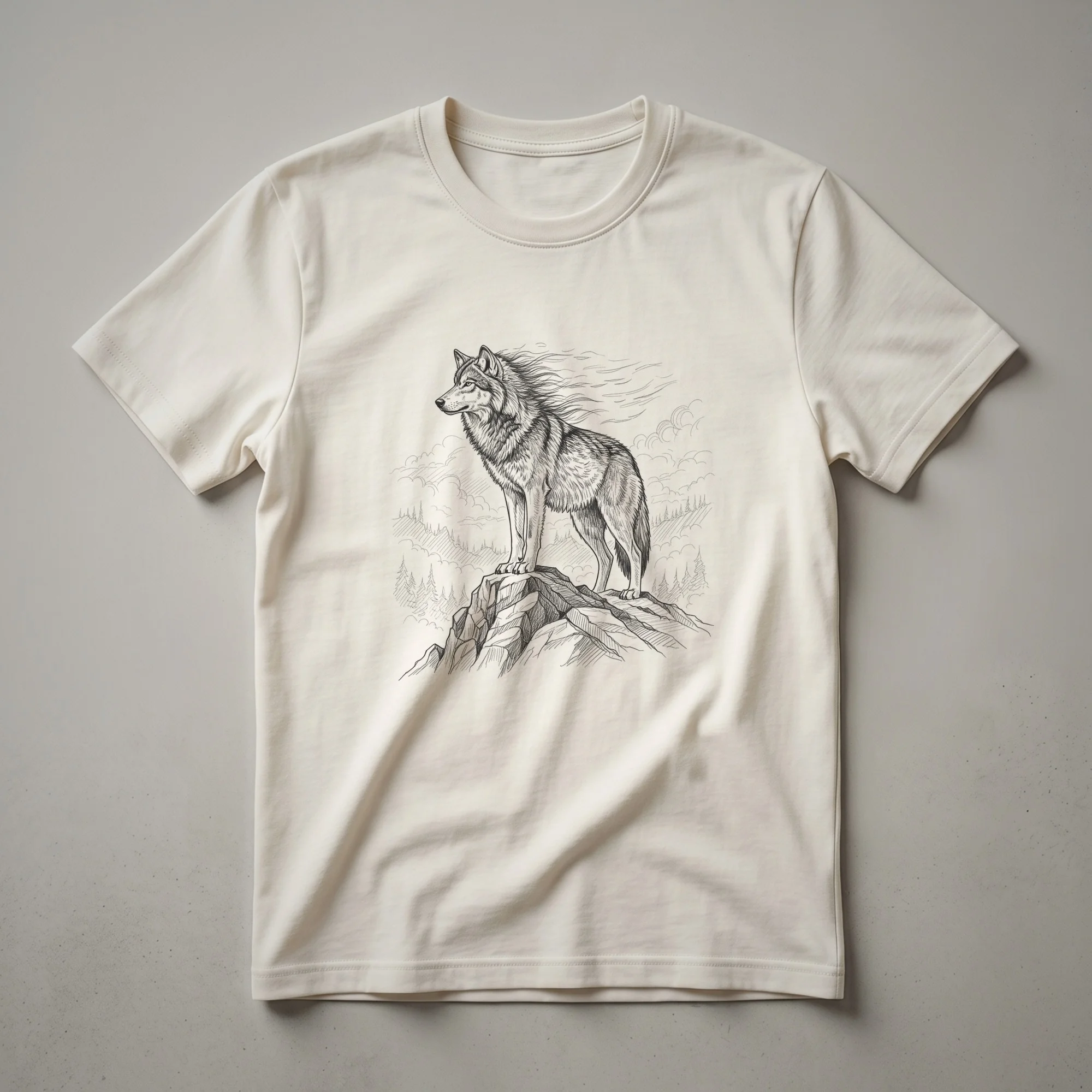 Wildlife enthusiasts and nature lovers will appreciate this striking graphic tee featuring a lone wolf. The detailed line art depicts a powerful wolf standing stoically on a rocky mountain peak, with a backdrop of trees and distant mountains. This design captures the wild spirit of the wolf, an iconic symbol of untamed wilderness. Wolves, known for their intelligence and social pack structure, inhabit diverse environments across the Northern Hemisphere, from dense forests to open plains. This shirt is a thoughtful gift for anyone who admires these magnificent creatures and the rugged beauty of their natural habitat. It's a go-to tee for hikers, campers, or anyone who feels a connection to the wild. Wear this t-shirt to express your appreciation for the natural world and its most majestic inhabitants. This apparel is a staple in the collection for those who cherish the great outdoors and the creatures that roam within it.