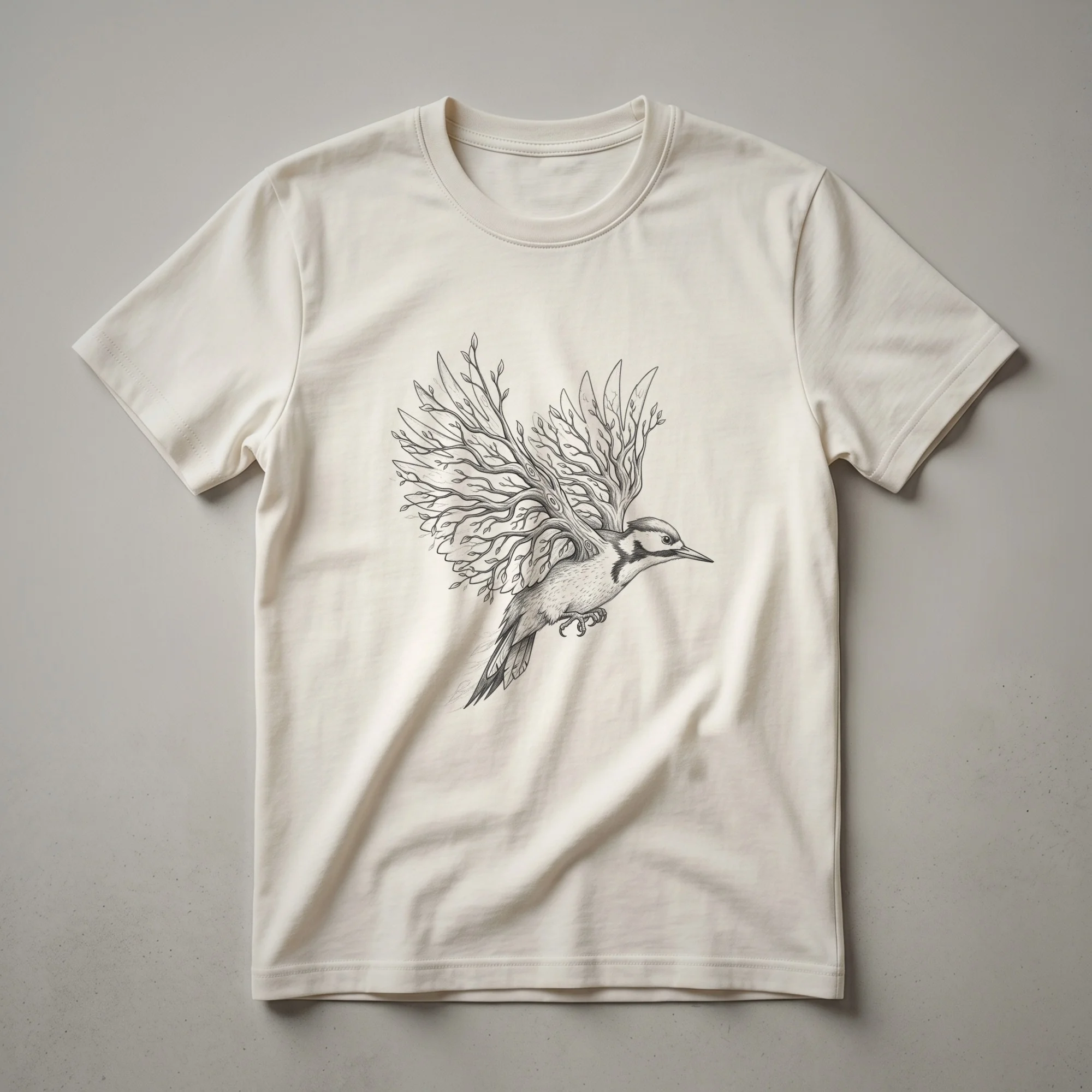Woodpeckers, known for their distinctive drumming and tree-climbing abilities, are beautifully rendered in this vintage-style line art t-shirt. The design features a woodpecker in mid-flight, its wings artfully transforming into intricate tree branches adorned with delicate leaves. This unique graphic tee captures the essence of the natural world, blending avian grace with arboreal imagery. Woodpeckers are vital to forest ecosystems, creating cavities that provide shelter for other wildlife. This shirt is a striking piece of apparel for any bird watcher, hiker, or individual who appreciates the intricate beauty of wildlife art. It makes a thoughtful gift for someone who cherishes the outdoors and the creatures that inhabit it. Wear this unique t-shirt to your next nature walk or casual outing to express your connection to the wild. The detailed linework evokes a classic, artistic feel, making it a standout addition to any nature lover's wardrobe. This tee is a conversation starter for anyone who admires the resilience and artistry found in nature.