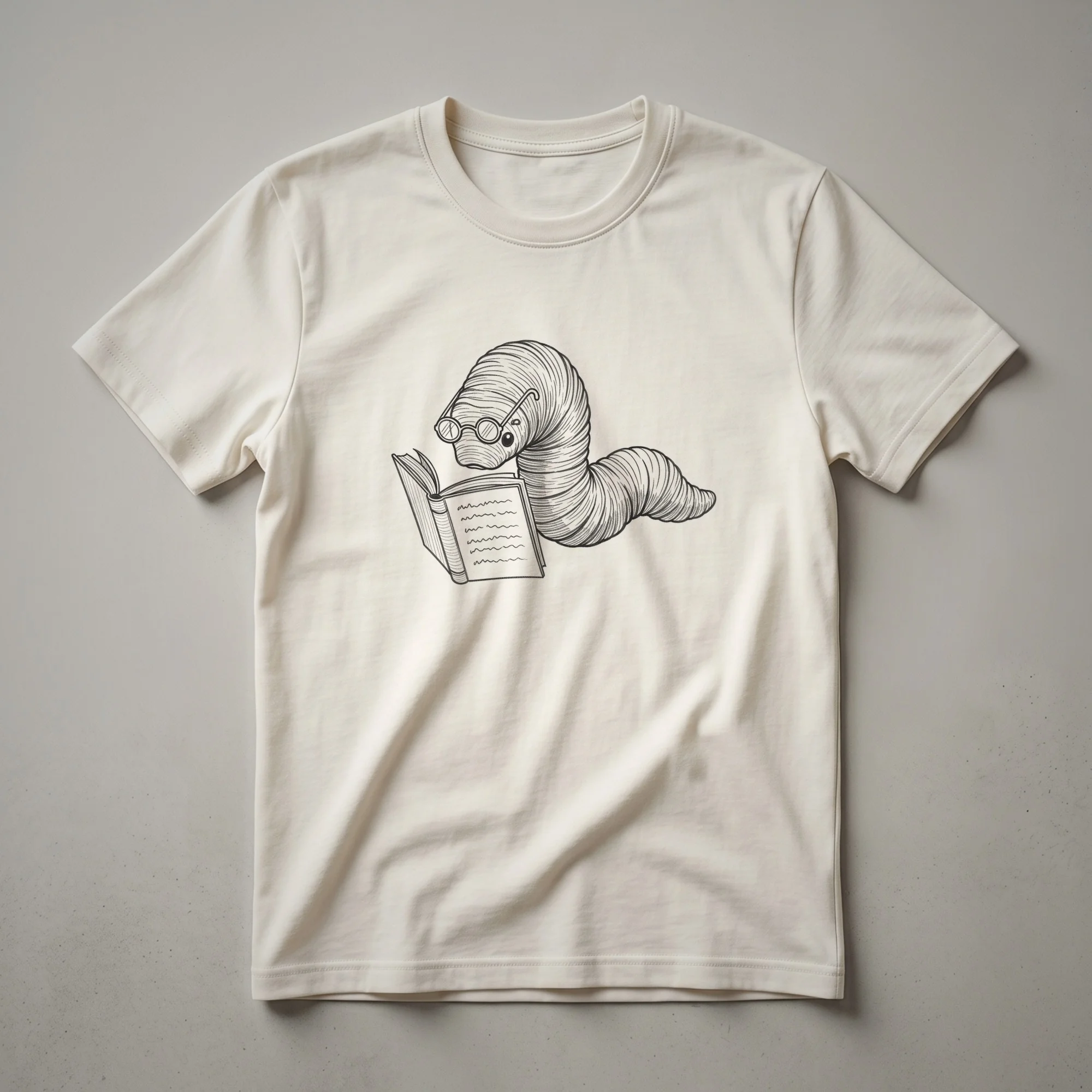 - Graphic t-shirt featuring a vintage worm reading a book, ideal for book lovers.