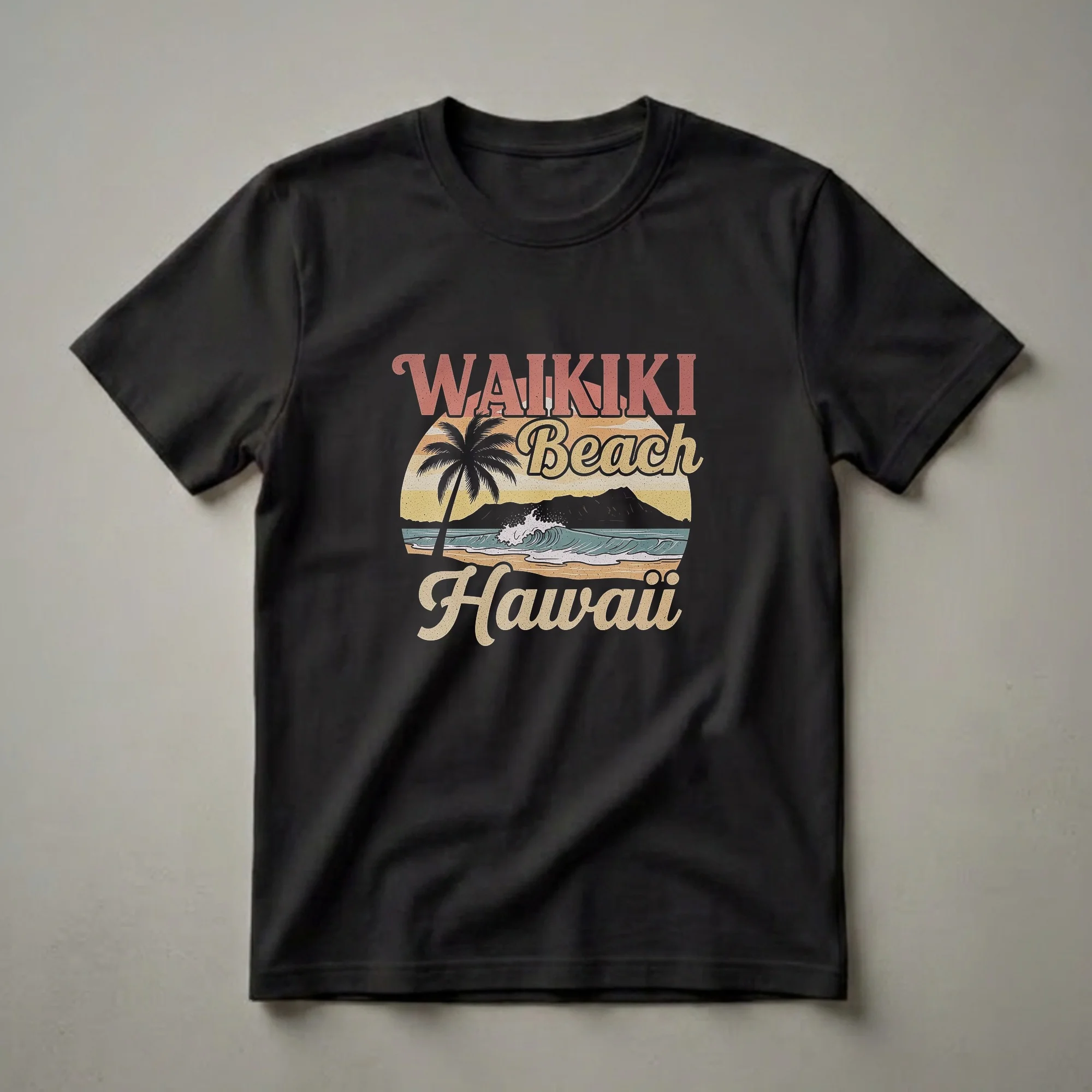 - Retro Waikiki Beach graphic tee celebrating Oahu's iconic sunset.