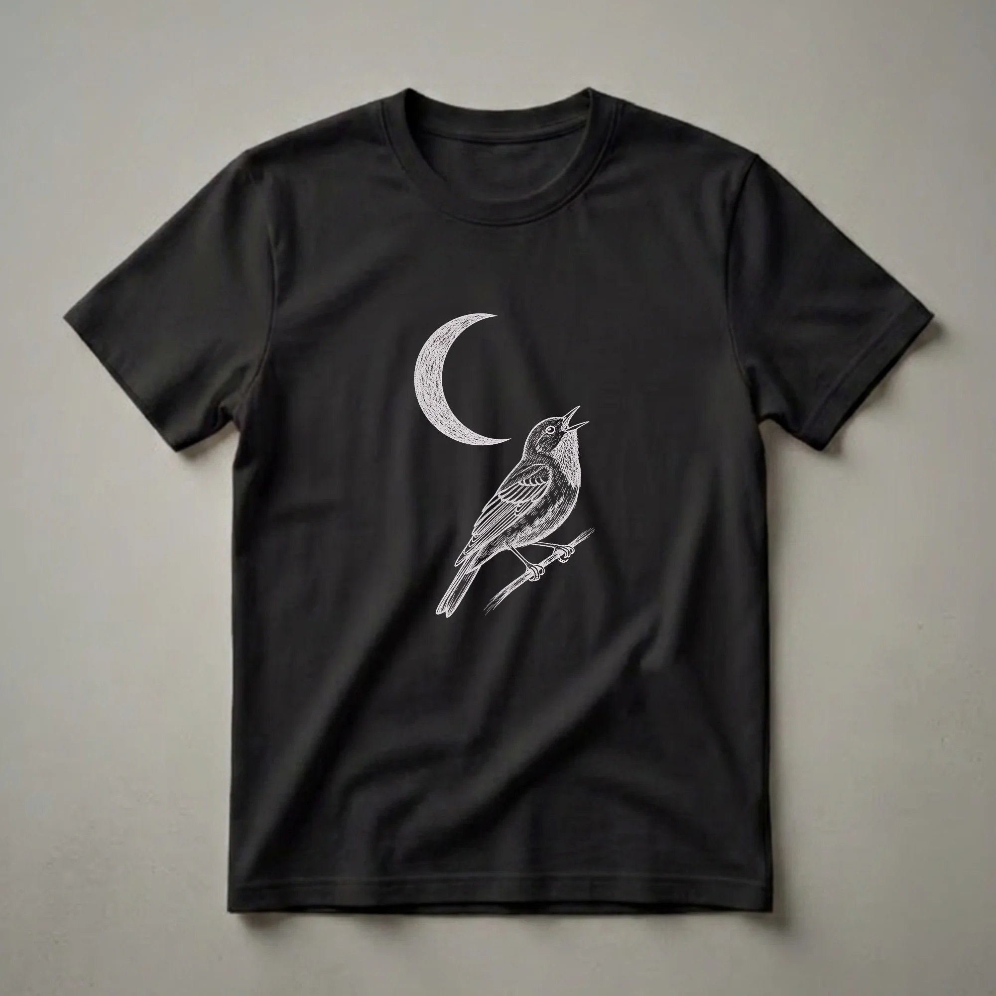 Bird watchers and nature enthusiasts will appreciate this striking graphic tee featuring a detailed line drawing of a warbler perched on a branch, with a crescent moon overhead. The art style mimics chalk on a blackboard, giving it a vintage and artistic feel. Warblers are small, active songbirds known for their vibrant plumage and complex songs, often found flitting through trees and shrubs in diverse habitats across North America. This shirt is a thoughtful gift for anyone who finds solace in the natural world, enjoys birdwatching, or simply admires the beauty of wildlife art. It's a go-to tee for casual outings, nature walks, or simply relaxing at home while dreaming of the outdoors. The monochromatic design on a dark background makes the intricate details of the bird and moon stand out, creating an eye-catching statement piece for your wardrobe. Wear this t-shirt to express your connection to the wild and celebrate the serene beauty of a moonlit night.