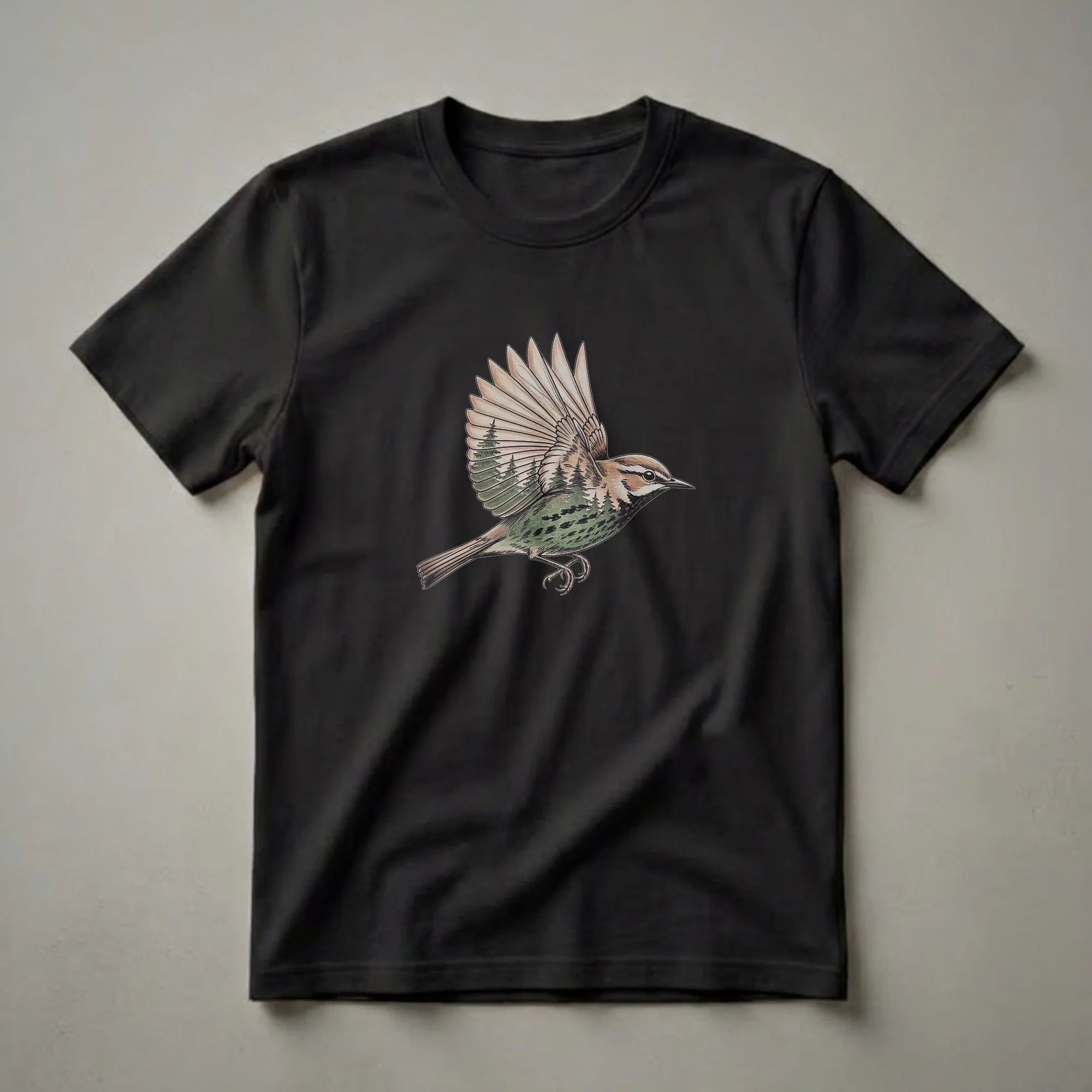 Nature lovers and birdwatchers will appreciate this striking t-shirt featuring a vintage-style drawing of a warbler in mid-flight. The intricate artwork seamlessly integrates a dense forest landscape into the bird's wings and body, creating a unique and eye-catching design. Warblers are a diverse group of small passerine birds known for their energetic foraging habits, often flitting through trees and shrubs in search of insects. This graphic tee captures the essence of these agile creatures and their natural habitat. The detailed illustration evokes a sense of the wild, making it a go-to tee for anyone who cherishes the outdoors. This shirt works well for hikers, ornithologists, or anyone who finds solace in the natural world. It makes a thoughtful gift for the bird enthusiast in your life who enjoys unique wildlife apparel. Wear this shirt on your next nature walk, to a birdwatching outing, or simply as a daily reminder of the beauty of the avian world.