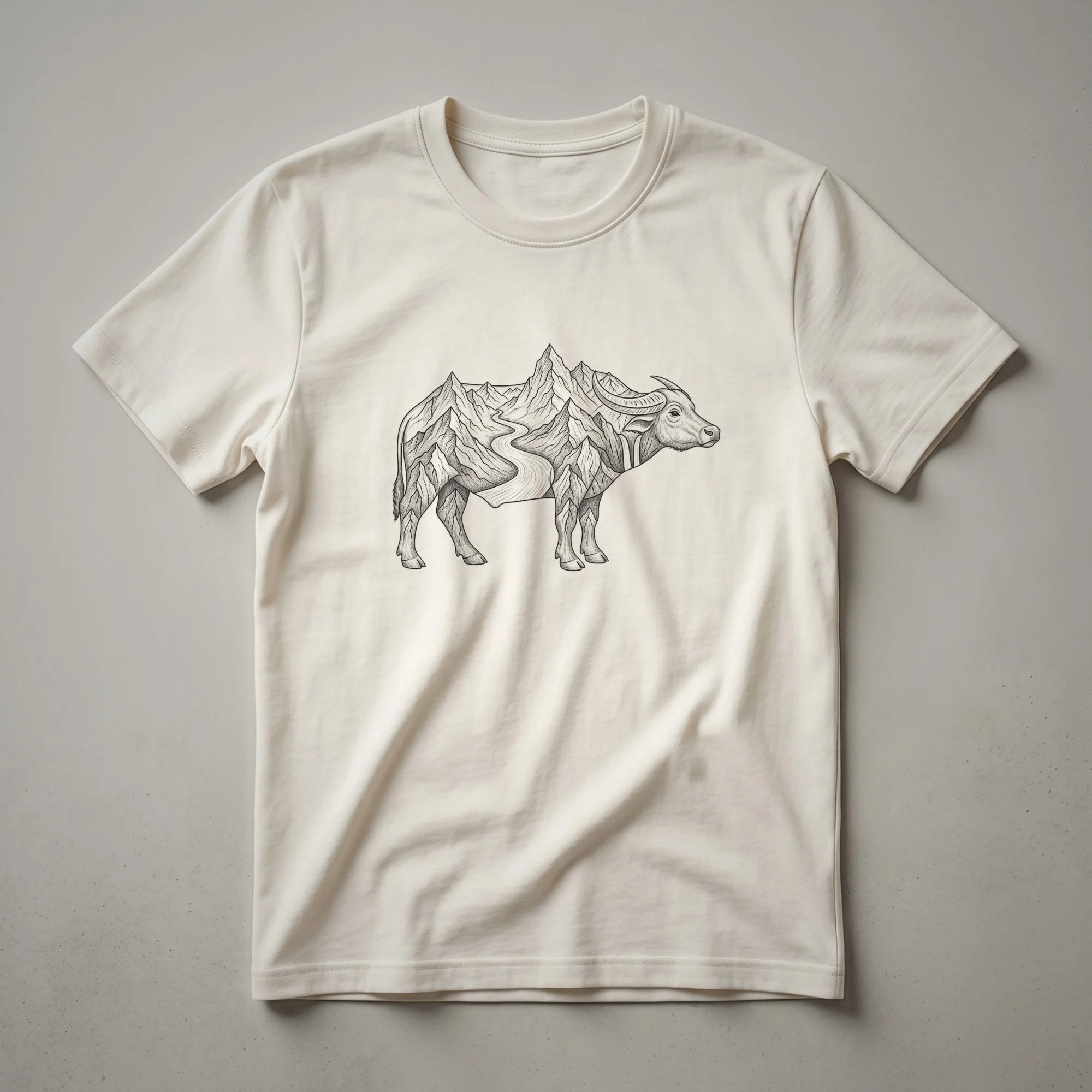 Wildlife enthusiasts and lovers of the great outdoors will appreciate this distinctive water buffalo t-shirt. The design showcases a detailed line drawing where the majestic form of a water buffalo is artfully blended with a rugged mountain landscape and a winding river. This creative concept merges the power of the mammal with the grandeur of nature, offering a unique visual narrative. Water buffalo, also known as Asian buffalo, are large bovines native to the Indian subcontinent, Southeast Asia, and China. They are often found in wetlands, grasslands, and forests, playing a vital role in their ecosystems. This shirt is a thoughtful gift for anyone who admires these powerful creatures or enjoys hiking and exploring natural terrains. It's a go-to tee for casual outings, nature walks, or simply relaxing at home while celebrating your connection to the wild. Wear this eye-catching apparel to express your passion for wildlife and scenic vistas.