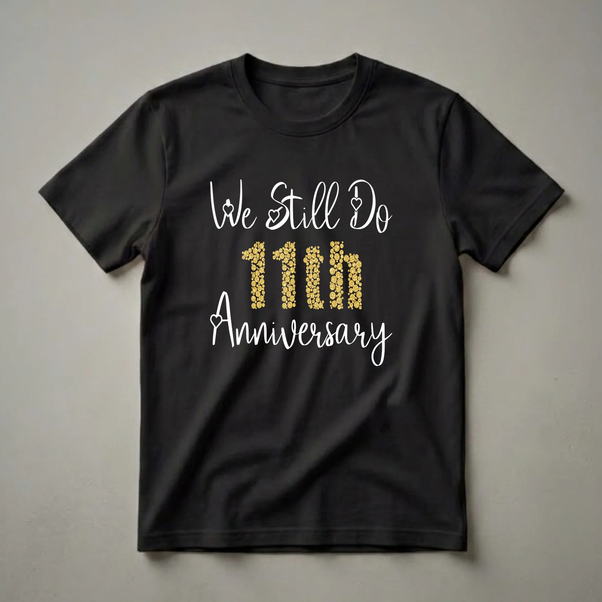 Couples celebrating their 11th anniversary can proudly display their enduring love with this 'We Still Do' t-shirt. The design features elegant white script that reads 'We Still Do', accented with charming hearts. Below, the number '11th' is rendered in a striking pattern of shimmering gold circles, symbolizing the preciousness of eleven years together. Completing the design is the word 'Anniversary' in flowing white script. This shirt is a thoughtful gift for any couple reaching this significant milestone, marking over a decade of shared life and commitment. It's a wonderful way for husbands and wives to commemorate their journey and reaffirm their bond. Wear this anniversary shirt to a special dinner, a vow renewal ceremony, or a casual celebration with friends and family to showcase your lasting partnership. The eleventh anniversary is traditionally associated with steel, symbolizing strength and durability, much like a marriage that has thrived for over a decade.