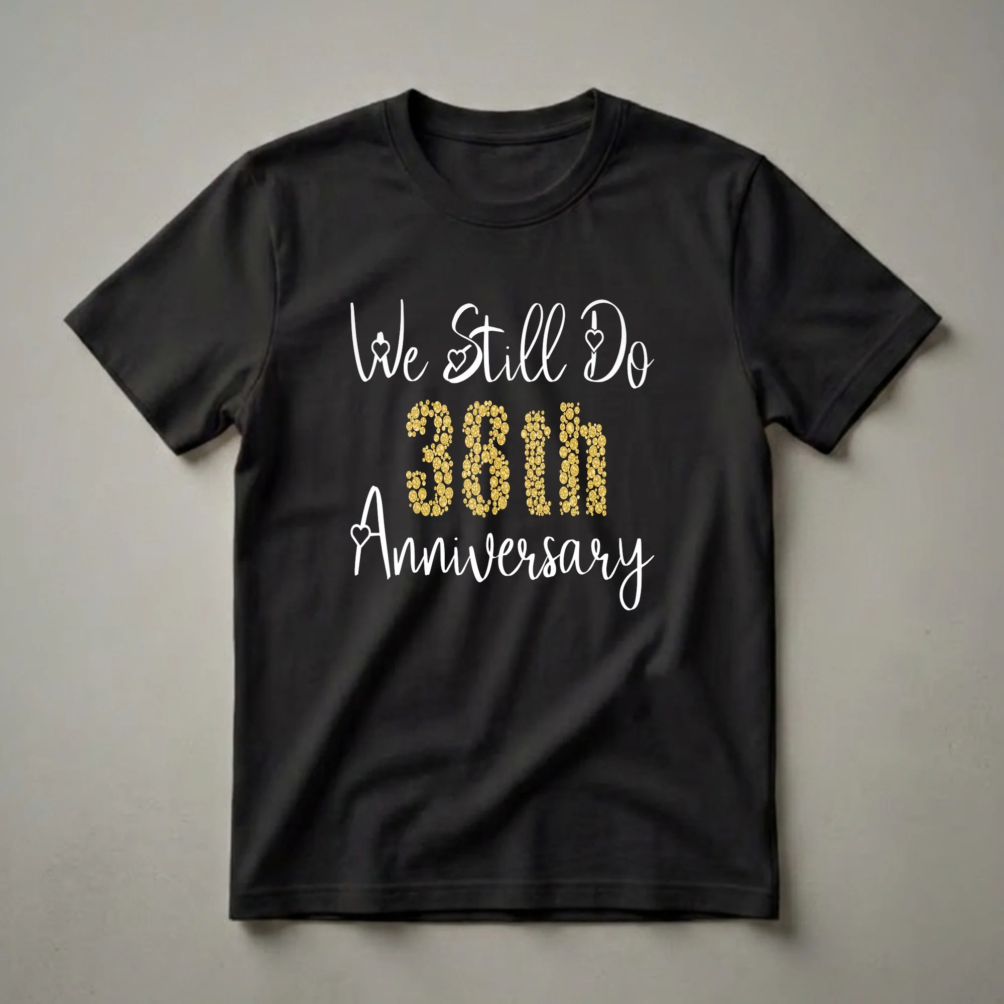 Couples celebrating their 38th wedding anniversary can proudly display their enduring love with this "We Still Do" t-shirt. The design features elegant white script text that reads "We Still Do" and "Anniversary," framing a striking "38th" in a shimmering gold glitter effect. This tee is a wonderful way for husbands and wives to commemorate nearly four decades of commitment and shared life. Thirty-eight years of marriage is a significant milestone, often associated with the traditional gift of a ruby, symbolizing passion and protection. This shirt serves as a modern, wearable tribute to that enduring bond. It’s a thoughtful gift idea for the couple who has built a lifetime of memories together, or for one spouse to gift the other as a sweet reminder of their vows. Wear this special anniversary shirt to a celebratory dinner, a family gathering, or a casual outing to share your joy with the world. It's a staple in any couple's wardrobe for commemorating this special occasion.