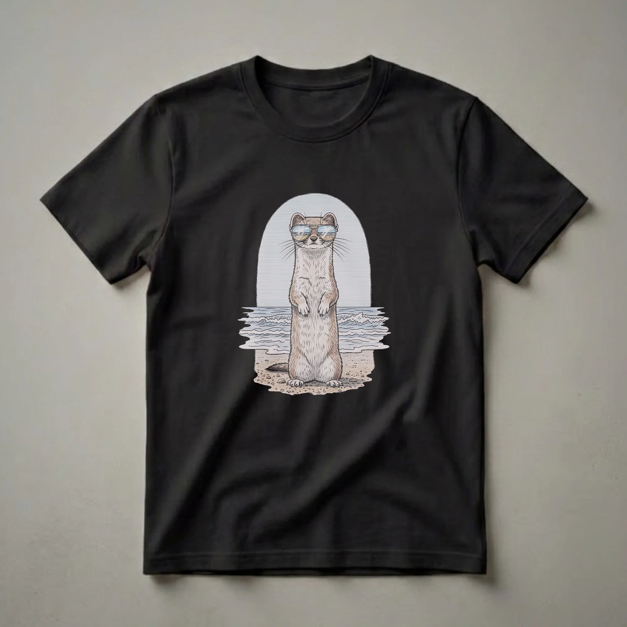 Wildlife enthusiasts and lovers of unique animal art will appreciate this striking graphic tee. The design features a detailed drawing of a weasel standing on a sandy beach, complete with a backdrop of gentle ocean waves under a soft sky. This particular weasel is sporting a pair of cool aviator sunglasses, reflecting a beach scene, giving it a relaxed and stylish demeanor. Weasels, known for their slender bodies and energetic nature, are found across various habitats worldwide, from forests to grasslands. This shirt captures a whimsical moment, imagining one of these agile mammals enjoying a day by the sea. It’s a thoughtful gift for anyone who admires the natural world or simply enjoys a touch of quirky art. This t-shirt is a conversation starter, a thoughtful choice for casual outings, hiking trips, or just lounging around. Wear it to express your appreciation for both wildlife and a laid-back beach vibe. This apparel is a go-to tee for any nature lover.