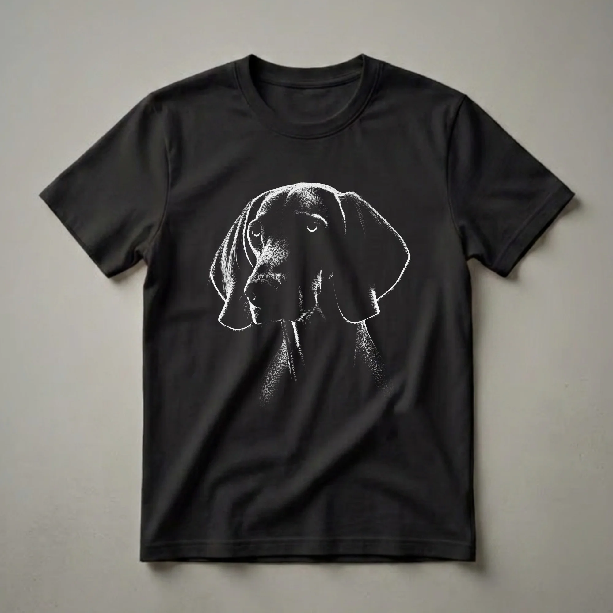 Show appreciation for your beloved Weimaraner with this bold black and white graphic t-shirt featuring a distinctive dog face illustration. This striking graphic tee captures the noble profile of a Weimaraner, rendered in a high-contrast, black and white artistic style. The detailed linework emphasizes the dog's expressive eyes and the sleek contours of its head, making it an eye-catching piece for any dog lover. Weimaraners, originally bred in Germany for hunting large game, are known for their intelligence and loyalty, often forming deep bonds with their families. This shirt is a wonderful way for a Weimaraner mom or dad to display their pride. It makes a thoughtful gift for the dog owner in your life who appreciates unique and artistic apparel. Wear this t-shirt to your next dog park visit or casual outing to spark conversations with fellow canine enthusiasts. It's a staple in the collection for anyone who adores their Weimaraner and wants to showcase that connection with stylish, comfortable apparel.