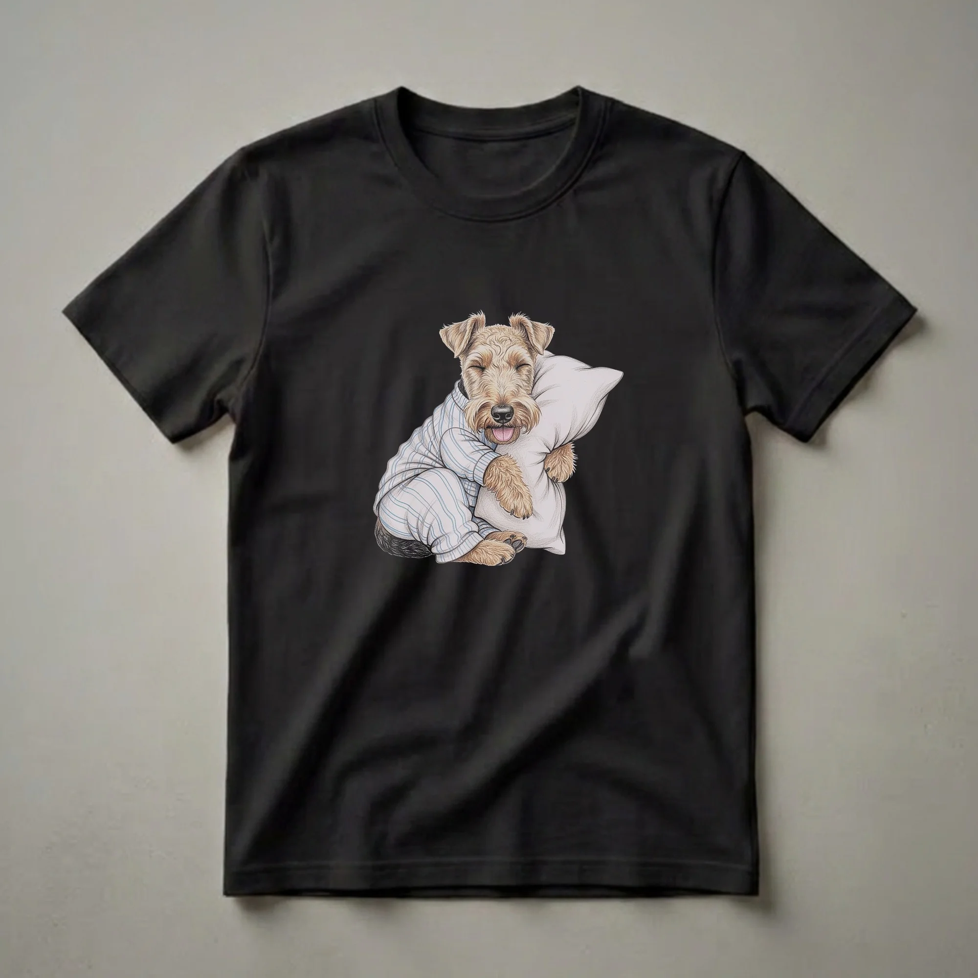 Welsh Terriers, known for their spirited and friendly nature, are captured in a moment of pure comfort with this unique graphic tee. The detailed drawing showcases a charming Welsh Terrier dressed in blue-striped pajamas, nestled in and hugging a soft pillow with its eyes closed and tongue playfully peeking out. This artistic depiction highlights the breed's distinctive wiry coat and expressive face, bringing a touch of whimsical charm to any wardrobe. The Welsh Terrier, originating from Wales, was historically used for hunting vermin, but this design celebrates their softer, more domestic side. This t-shirt is a thoughtful gift for any dog mom or dog dad who adores their canine companion, especially those who appreciate the breed's lively personality and distinctive appearance. It's a go-to tee for relaxed weekends, casual outings, or simply lounging at home, making it a staple in the collection for any dog enthusiast. Imagine wearing this eye-catching shirt to a dog park meet-up or a casual brunch, sparking conversations about your love for these wonderful dogs.