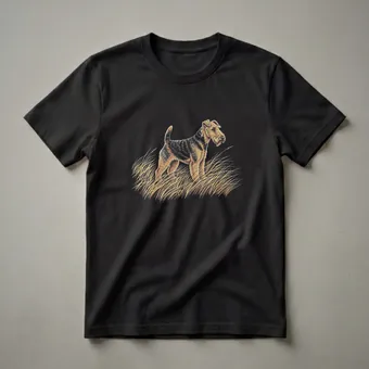 Fellow Welsh Terrier enthusiasts will adore this artistic t-shirt showcasing a beautifully rendered drawing of their favorite spirited breed. This eye-catching t-shirt features a detailed drawing of a Welsh Terrier standing alertly amidst tall, golden grass, capturing the dog's characteristic alert stance and textured fur. The Welsh Terrier, originating from Wales, is known for its lively and affectionate nature, often described as a fearless and friendly companion. This breed was historically used for hunting vermin, showcasing their tenacity and intelligence. This graphic tee is a wonderful way for any Welsh Terrier mom or dad to express their affection for their four-legged family member. It makes a thoughtful gift for birthdays, holidays, or just because. Imagine wearing this shirt to your next dog park visit or a casual outing with fellow dog enthusiasts. This unique apparel celebrates the charm and character of the Welsh Terrier, making it a go-to tee for breed aficionados. This shirt is a fantastic way to show off your pride in this distinctive breed.