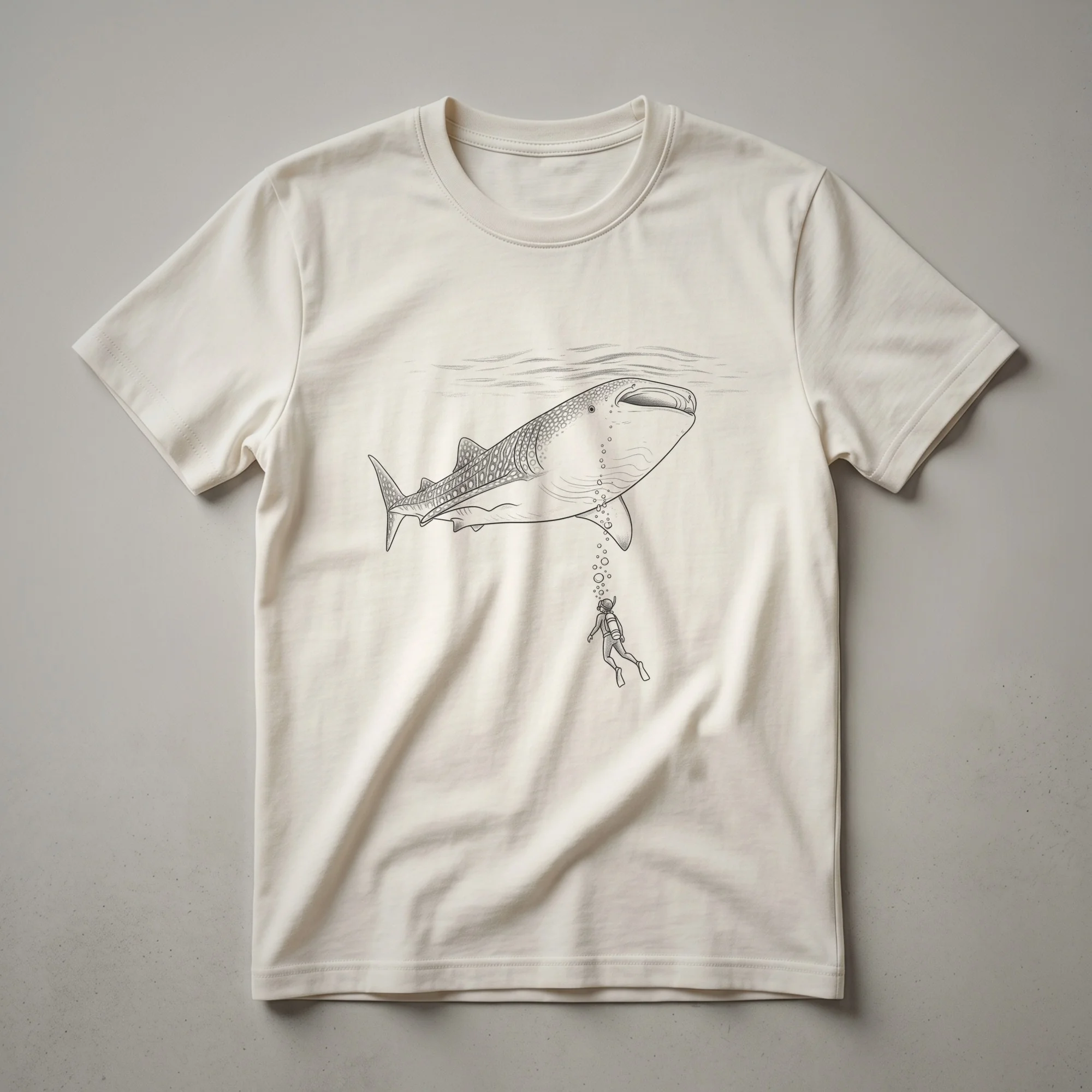 Marine life enthusiasts and ocean explorers will appreciate this striking graphic tee featuring a vintage-style line drawing of a whale shark. The artwork captures a moment of awe as a lone diver, equipped with a snorkel and fins, ascends towards the massive, spotted creature. Whale sharks, the largest fish in the sea, are filter feeders known for their gentle nature and distinctive patterns, often found in tropical and warm-temperate oceans worldwide. This shirt is a thoughtful gift for divers, marine biologists, or anyone captivated by the underwater world. It's a great conversation starter and a staple in the collection for those who dream of swimming alongside these magnificent giants. Wear this t-shirt to your next dive trip, to the aquarium, or simply when you want to showcase your passion for the ocean's most incredible inhabitants. This unique apparel celebrates the wonder of marine exploration and the majestic presence of the whale shark.