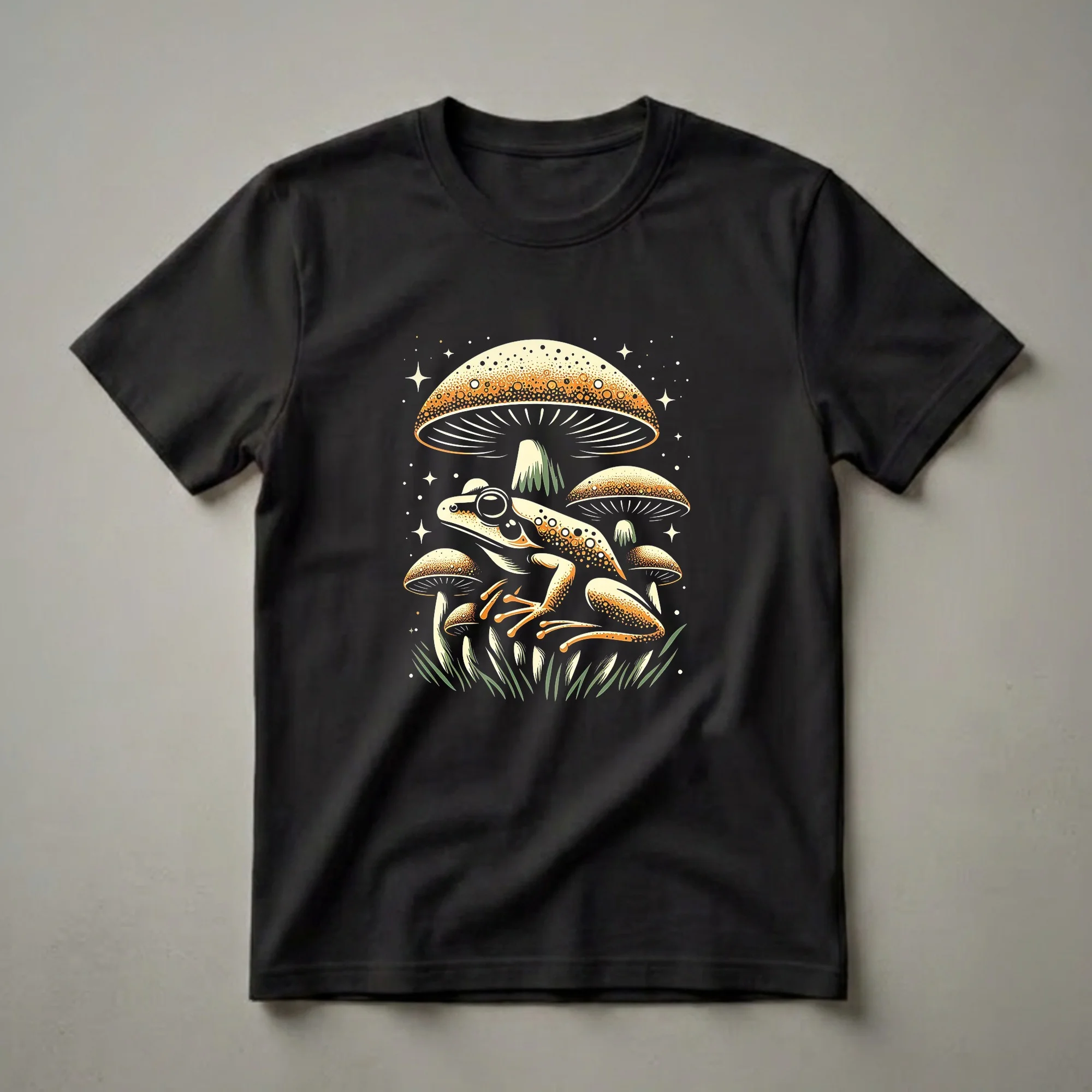 Nature enthusiasts and reptile fans will appreciate this eye-catching graphic tee featuring a whimsical scene. The design showcases a stylized frog with orange and yellow speckles, wearing round glasses, perched among a cluster of fantastical mushrooms. These mushrooms, rendered in warm orange and cream tones with detailed gills and speckled caps, create a magical forest floor setting. Scattered stars and small white dots suggest a mystical night sky above the scene, while blades of green grass anchor the composition. Frogs, like the common tree frog, are amphibians known for their ability to camouflage and their vital role in wetland ecosystems. This t-shirt is a thoughtful gift for anyone who adores amphibians or finds enchantment in the natural world. It's a go-to tee for casual outings, nature walks, or simply relaxing at home. Wear this shirt to express your love for the quirky beauty of the natural world and its fascinating inhabitants.