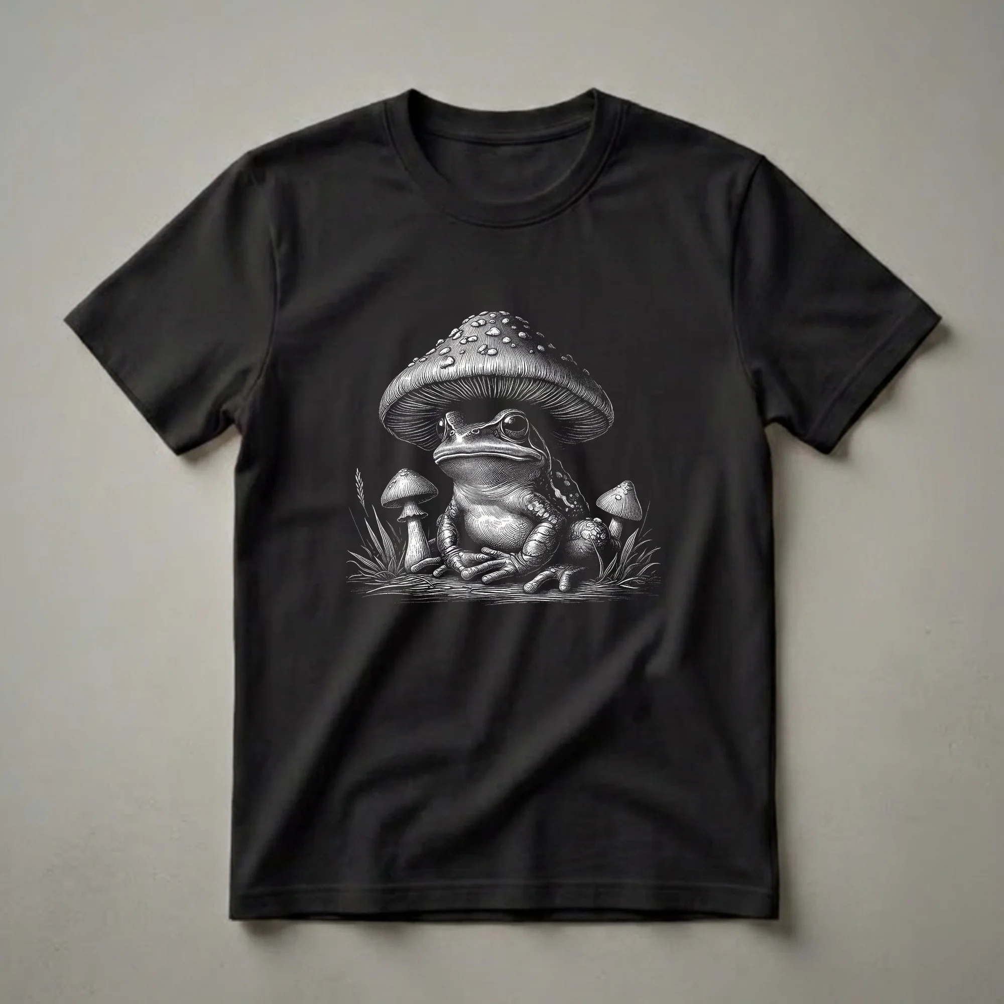 Reptile enthusiasts and lovers of the whimsical will appreciate this striking graphic tee. The design showcases a detailed, black and white illustration of a frog seated serenely beneath a large, spotted mushroom. Flanking the central figure are two smaller mushrooms and blades of grass, all rendered in an intricate, vintage engraving style. This artistic depiction evokes a sense of a hidden, enchanted garden, a place where amphibians and fungi coexist in harmony. Frogs, known for their vital role in wetland ecosystems and their fascinating life cycles, are often associated with nature's quiet beauty. This shirt is a thoughtful gift for anyone who finds joy in the natural world, particularly those fascinated by amphibians and the often-overlooked beauty of mushrooms. It makes a wonderful present for birthdays or as a unique surprise for a friend who cherishes unique art and creature-inspired apparel. Wear this eye-catching t-shirt to casual outings, nature walks, or to express your unique style.
