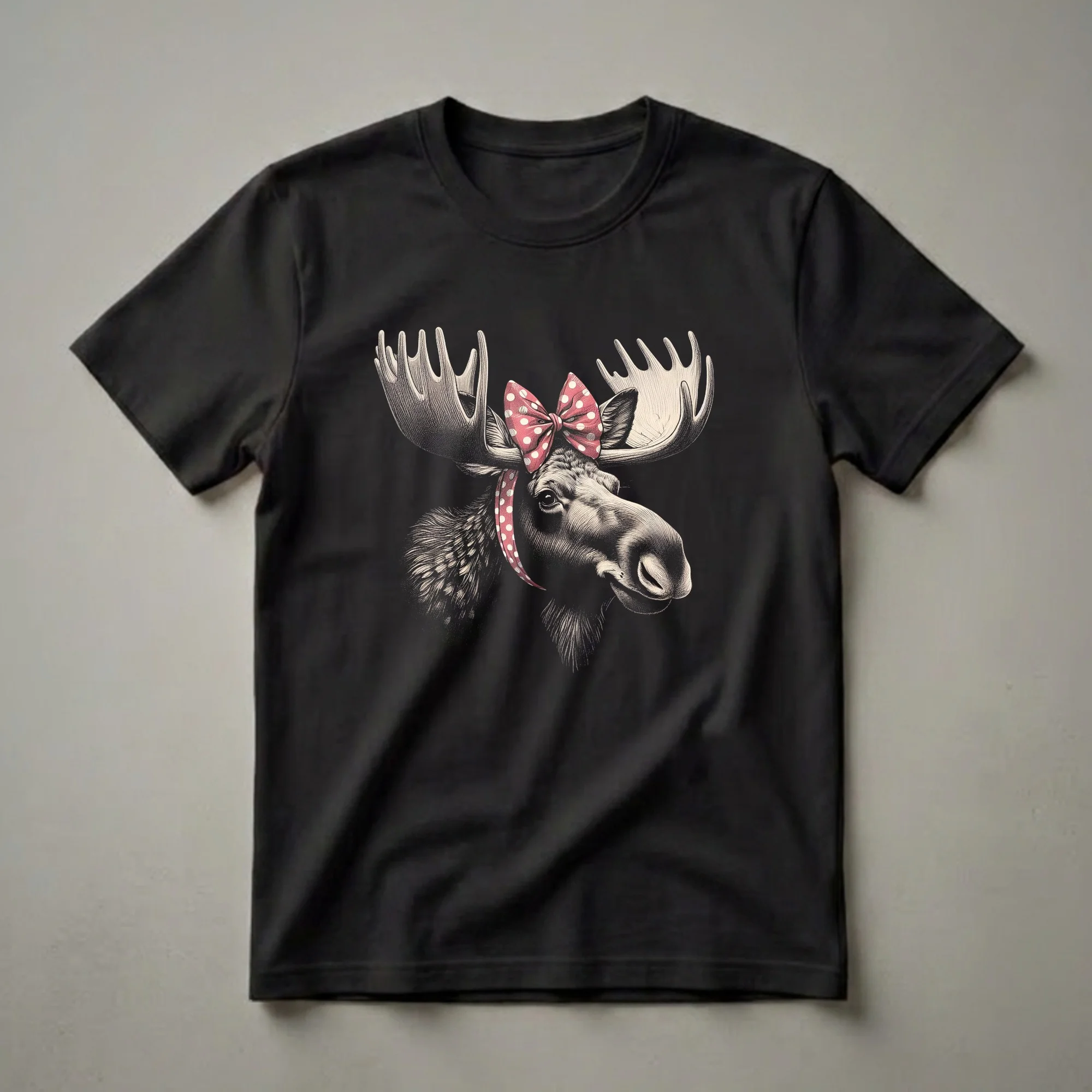 Moose, the largest members of the deer family, are iconic inhabitants of northern forests and woodlands across North America and Eurasia. This striking graphic tee captures the majestic presence of a moose with a whimsical twist. The detailed illustration features a bull moose adorned with a playful red and white polka dot bow and matching bandana, set against a stark black background. This unique design offers a charming contrast to the animal's natural ruggedness, making it a standout piece for any wardrobe. This t-shirt is a thoughtful gift for women and girls who appreciate wildlife art, nature, or simply enjoy a touch of quirky style. It's a go-to tee for casual outings, nature walks, or expressing your admiration for these magnificent creatures. The intricate linework and vintage aesthetic of the artwork bring the moose to life, making this shirt a conversation starter for any animal lover. Wear it to express your connection to the wilderness or to bring a smile to others' faces.