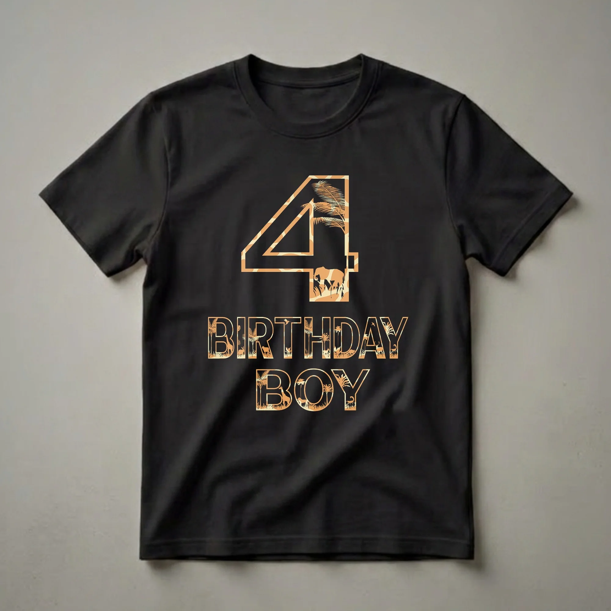 Four-year-old boys are entering a stage of incredible imagination and exploration, making this 'Wild 4' birthday tee a fantastic choice for their special day. The design showcases a bold number '4' and the phrase 'BIRTHDAY BOY,' both intricately filled with a vibrant safari scene. Within the graphics, you can spot silhouettes of elephants, giraffes, lions, deer, rabbits, and even a scorpion, all set against a backdrop of palm trees and lush foliage. This visual theme evokes the excitement of a zoo or a wild adventure, a thoughtful choice for a young explorer turning four. The overall aesthetic, with its warm orange and tan tones against a black background, gives it a striking, eye-catching appearance. This t-shirt is a thoughtful gift for any boy celebrating his fourth birthday, whether he's fascinated by animals or loves a jungle theme. He will reach for this shirt to wear to his birthday party, to the zoo, or just for everyday play, making it a memorable piece of birthday apparel.