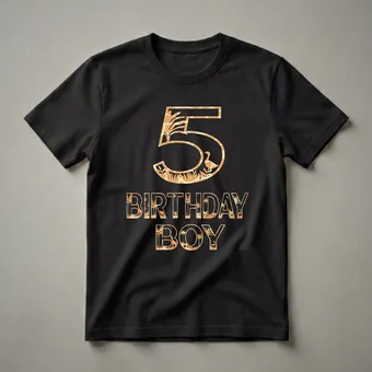 This striking graphic tee is worn by the adventurous 5-year-old boy celebrating his special day with a wild zoo or safari theme. The design prominently features a large number '5' filled with a vibrant jungle scene, complete with palm leaves and a curious duck. Below it, the words 'BIRTHDAY BOY' are presented in a bold font, also intricately filled with a detailed depiction of a savanna landscape. Within the letters, you can spot various animals like giraffes, rabbits, deer, lions, and even a scorpion, alongside lush tropical foliage and trees. This shirt is a fantastic way to bring the excitement of the animal kingdom to a child's birthday party. It's a thoughtful gift for any young explorer turning five who loves animals and adventure. Imagine him wearing this eye-catching t-shirt to his birthday brunch or as he opens presents, ready for a day of fun. This unique shirt is sure to be a hit, making his fifth birthday celebration even more memorable. It's a go-to tee for any child who dreams of safaris and encounters with exotic creatures.