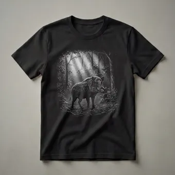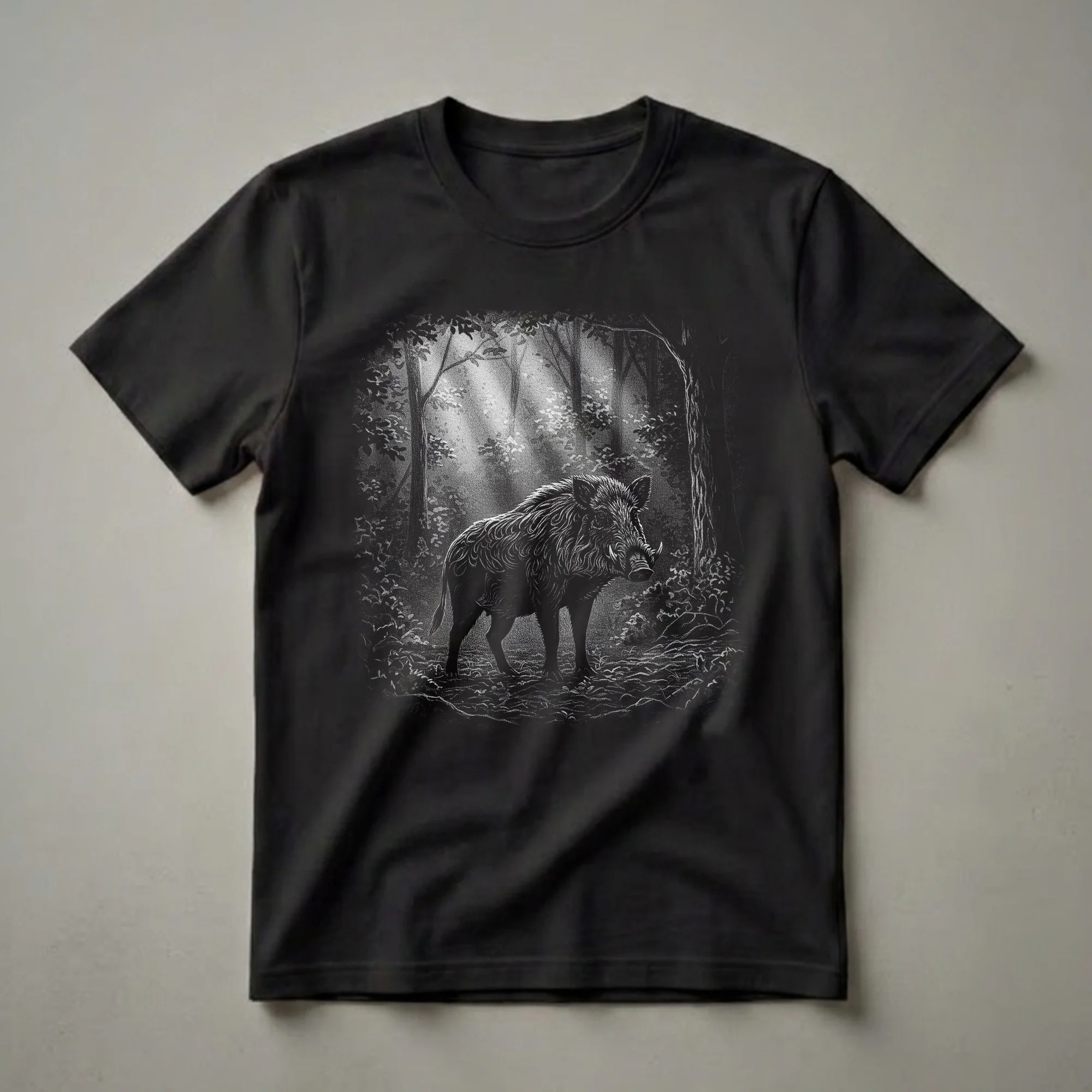 Wild boar enthusiasts will appreciate this striking graphic tee, showcasing a detailed illustration of a wild boar standing amidst a sun-dappled forest. The artwork captures the animal's rugged appearance, from its bristly mane to its tusks, set against a backdrop of trees and dappled light filtering through the canopy. Wild boars, also known as Sus scrofa, are native to much of Eurasia and North Africa, known for their intelligence and adaptability, often found in forests and woodlands. This shirt is a staple for anyone who admires these powerful creatures and the natural habitats they inhabit. It makes a thoughtful gift for hikers, wildlife photographers, or anyone who feels a connection to the untamed beauty of the forest. Wear this t-shirt on your next outdoor adventure or casual outing to express your passion for woodland wildlife. This unique shirt is a go-to tee for expressing your appreciation for the natural world.