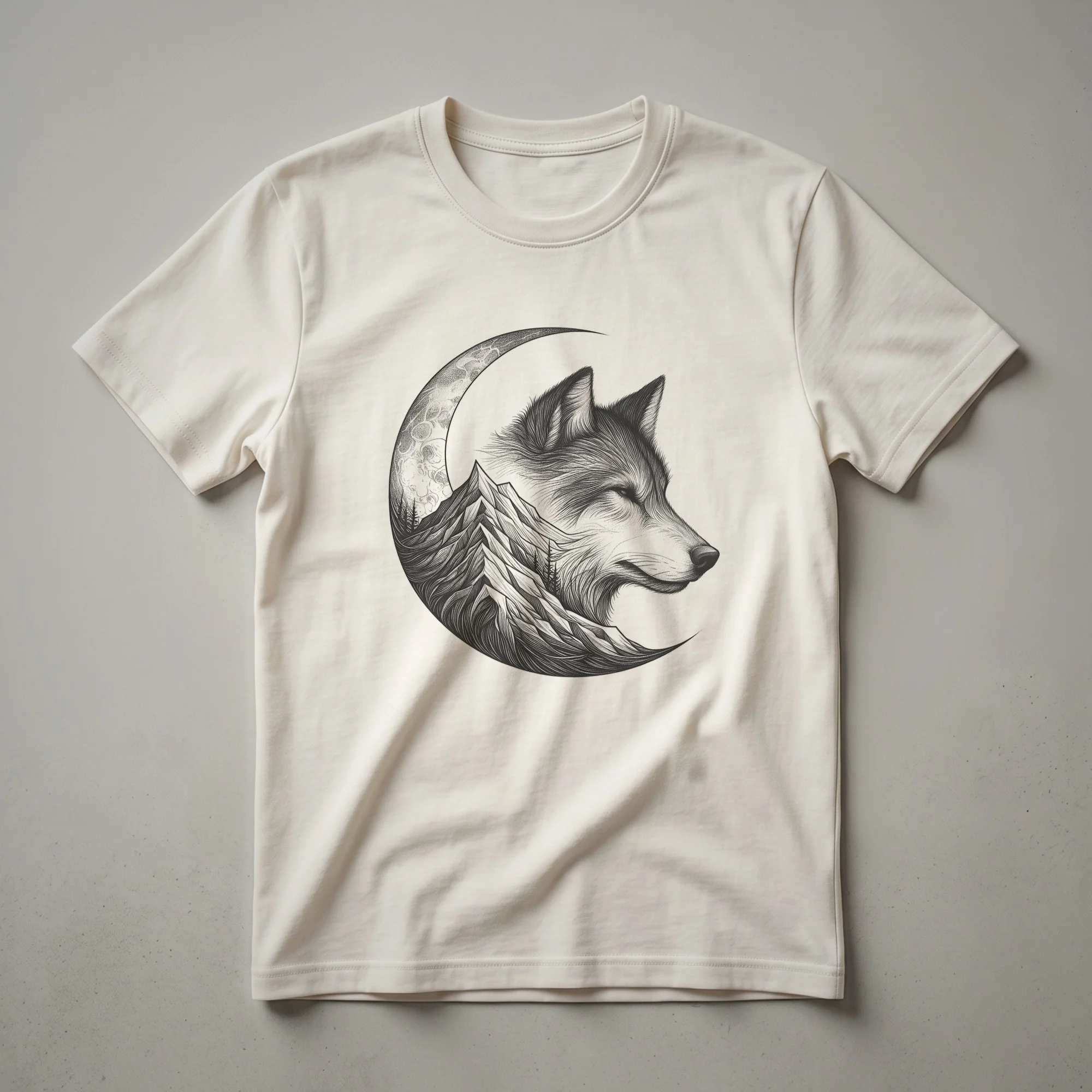 - Wolf head, mountain, and moon graphic tee for nature lovers.