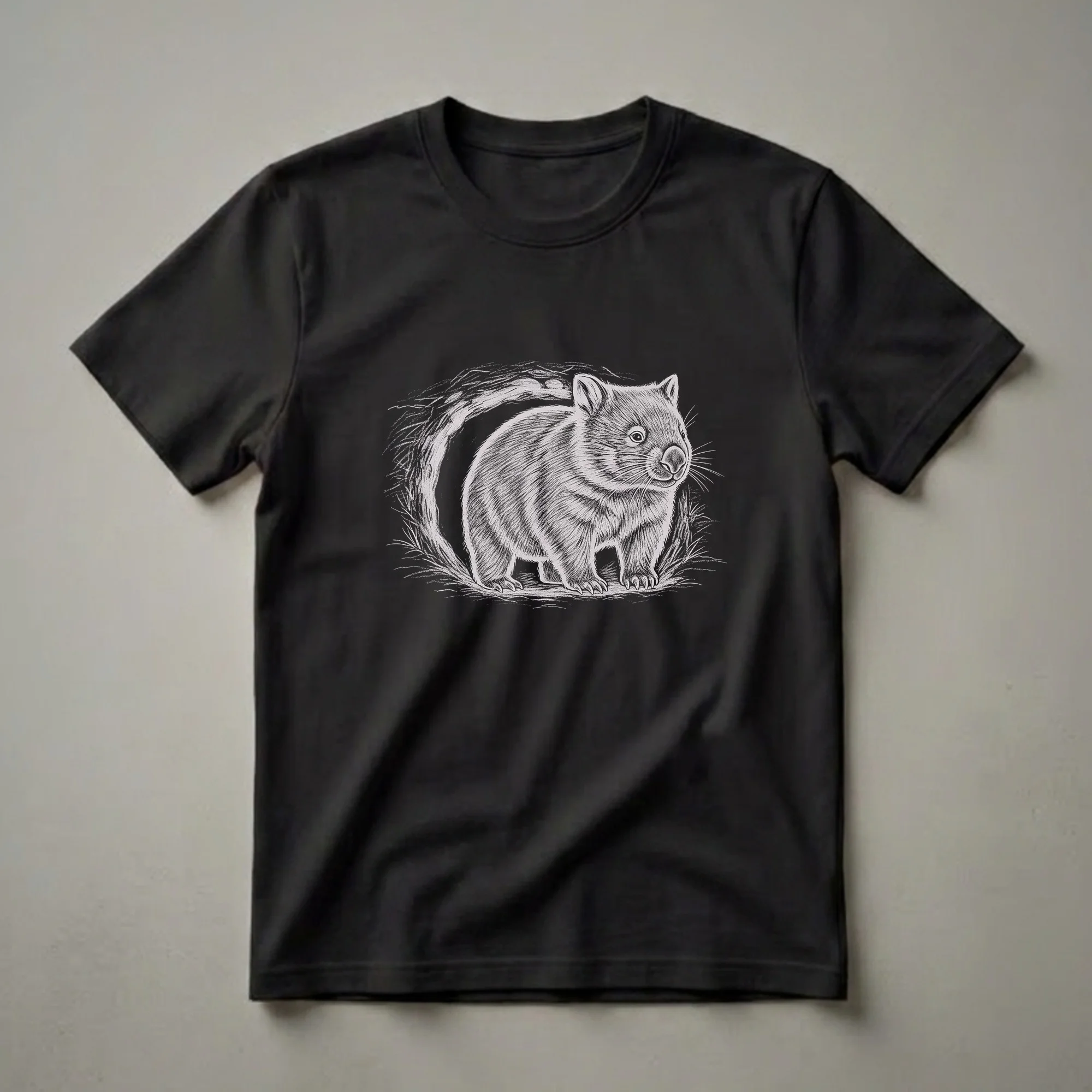 Wombat enthusiasts will appreciate this unique graphic tee featuring a detailed pencil-style drawing of a wombat. The artwork captures the sturdy, burrowing marsupial as it emerges from its underground home, surrounded by sketched grass and the entrance to its den. Wombats are native to Australia and are known for their powerful claws and their ability to dig extensive burrow systems, which can be up to 30 meters long. This shirt is a thoughtful gift for anyone who admires these fascinating creatures or enjoys the Australian outback. It's a go-to tee for casual outings, hiking trips, or simply relaxing at home while celebrating your passion for wildlife. The monochromatic sketch style gives it a vintage feel, making it a standout piece for any nature lover's wardrobe. Wear this t-shirt to express your connection to the wild and the unique animals that inhabit it. This apparel is a staple in the collection for any true wombat admirer.