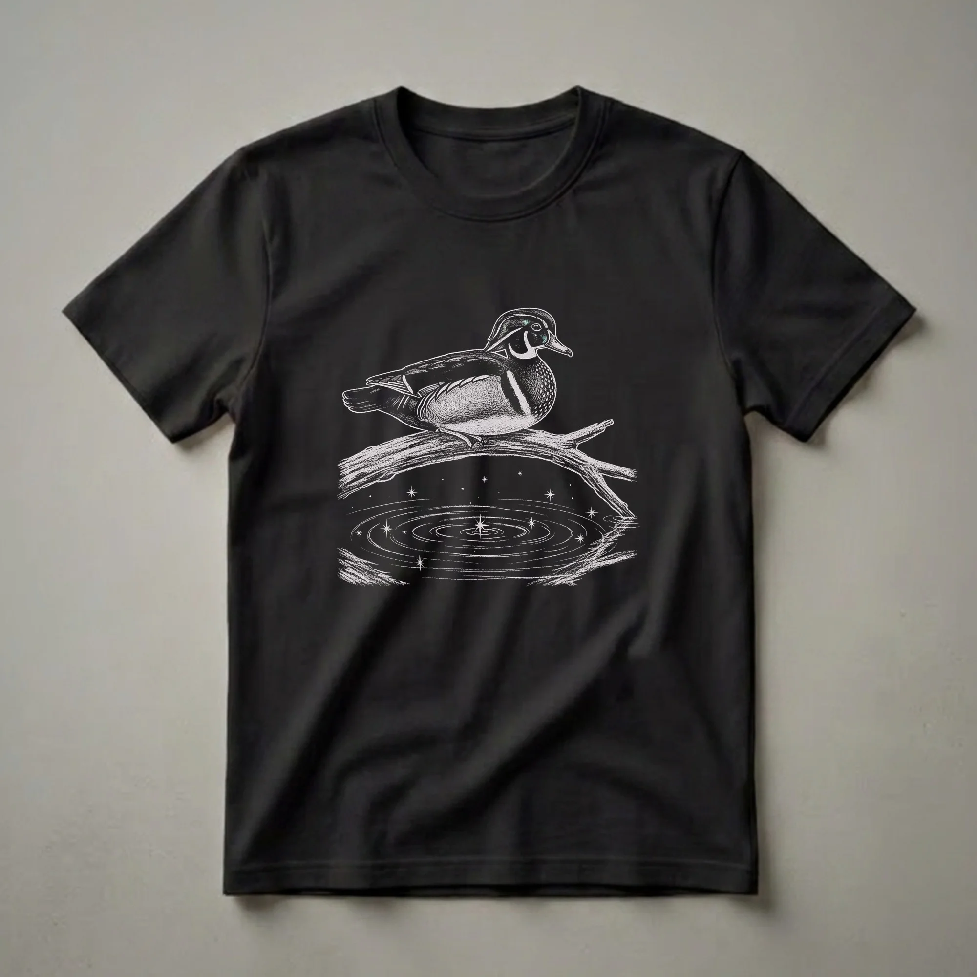 - Adorned with a vintage drawing of a male wood duck, this tee celebrates avian beauty.