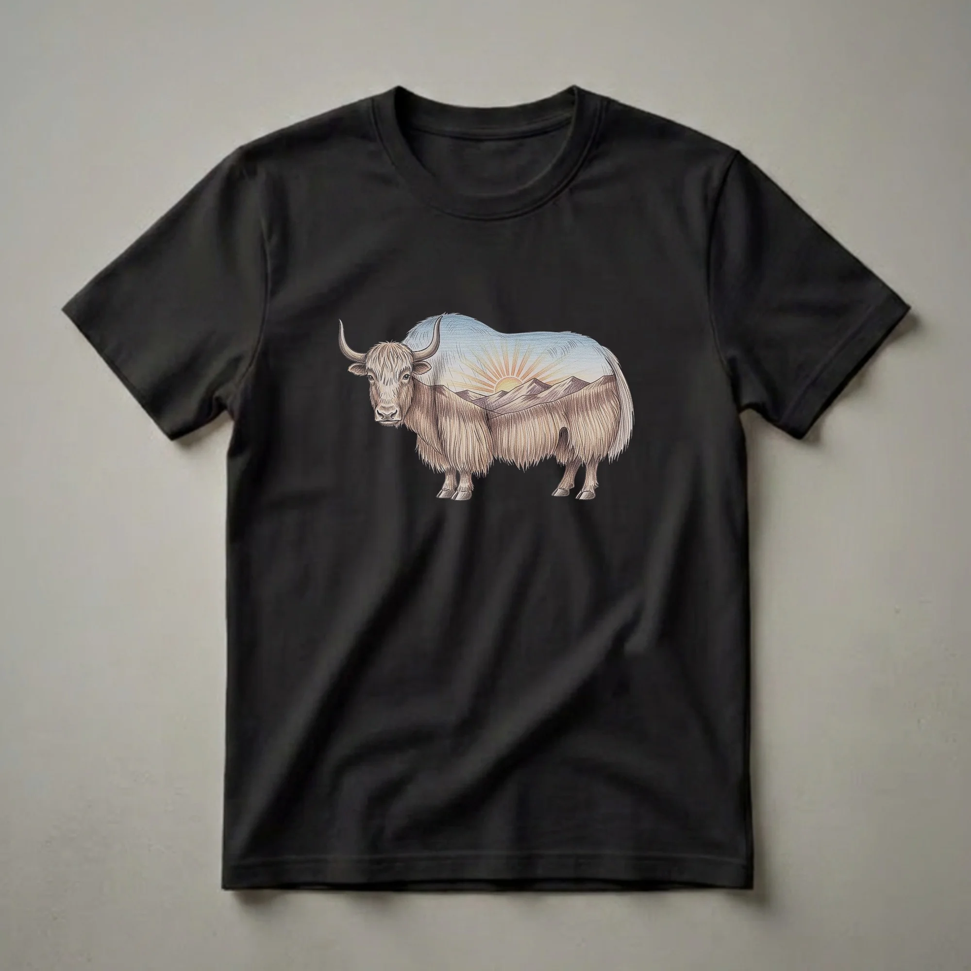 Wildlife enthusiasts who appreciate the rugged beauty of the Himalayas will reach for this striking yak t-shirt. The design features a detailed, colored pencil drawing of a yak, its shaggy fur rendered with intricate lines. Integrated within the yak's form is a serene mountain landscape at sunset, complete with a radiant sun rising over jagged peaks and a soft blue sky. Yaks are native to the Himalayan region of South Asia, known for their long, shaggy hair that provides insulation against the cold mountain climate. This unique graphic tee captures the essence of these majestic animals and their natural habitat. It makes a thoughtful gift for hikers, nature lovers, or anyone who admires the resilience of mountain wildlife. Wear this shirt on your next outdoor adventure or casual outing to showcase your connection to the wild.