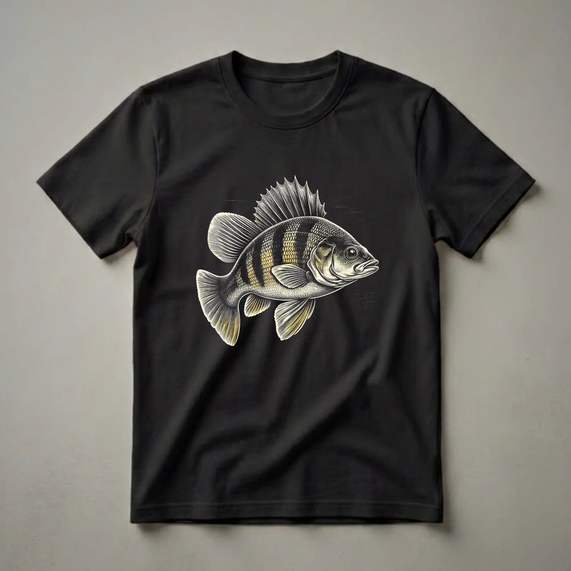Anglers who appreciate the thrill of the catch will reach for this Yellow Perch fish graphic tee. The design features a meticulously rendered illustration of the popular freshwater game fish, presented in a classic linocut style with bold lines and striking contrast against a deep black background. The Yellow Perch, known for its distinctive vertical bars and spiny dorsal fin, is depicted in exquisite detail, showcasing its scaled body and fin structure. These fish are commonly found in lakes, rivers, and reservoirs across North America, often inhabiting weedy areas and preferring cooler waters. They are a favorite target for sport fishermen due to their aggressive nature and delicious taste. This shirt is a thoughtful gift for the fisherman in your life, great to wear on your next fishing trip, to a casual outing with friends, or while sharing stories about your biggest catch. It’s a staple in the collection for anyone who enjoys freshwater angling and marine life art.