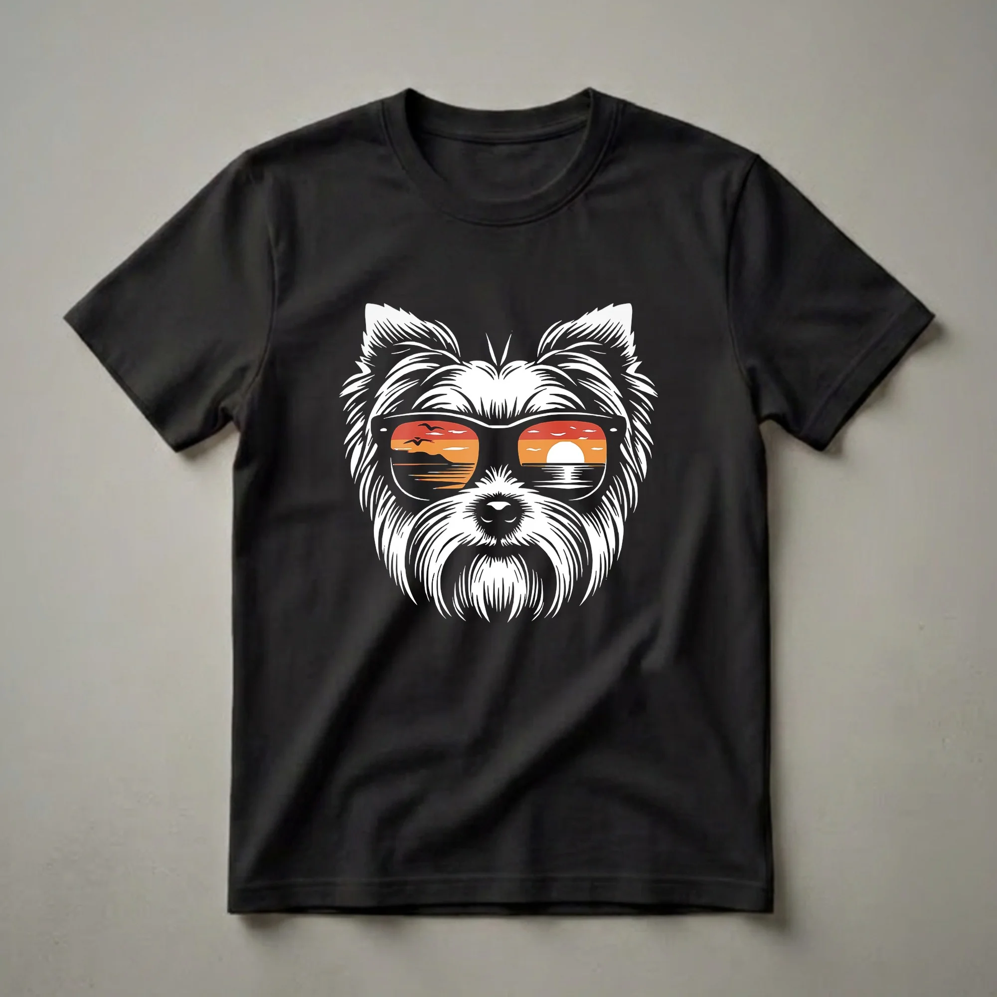 - Features a cool Yorkshire Terrier graphic wearing sunglasses with a sunset reflection.