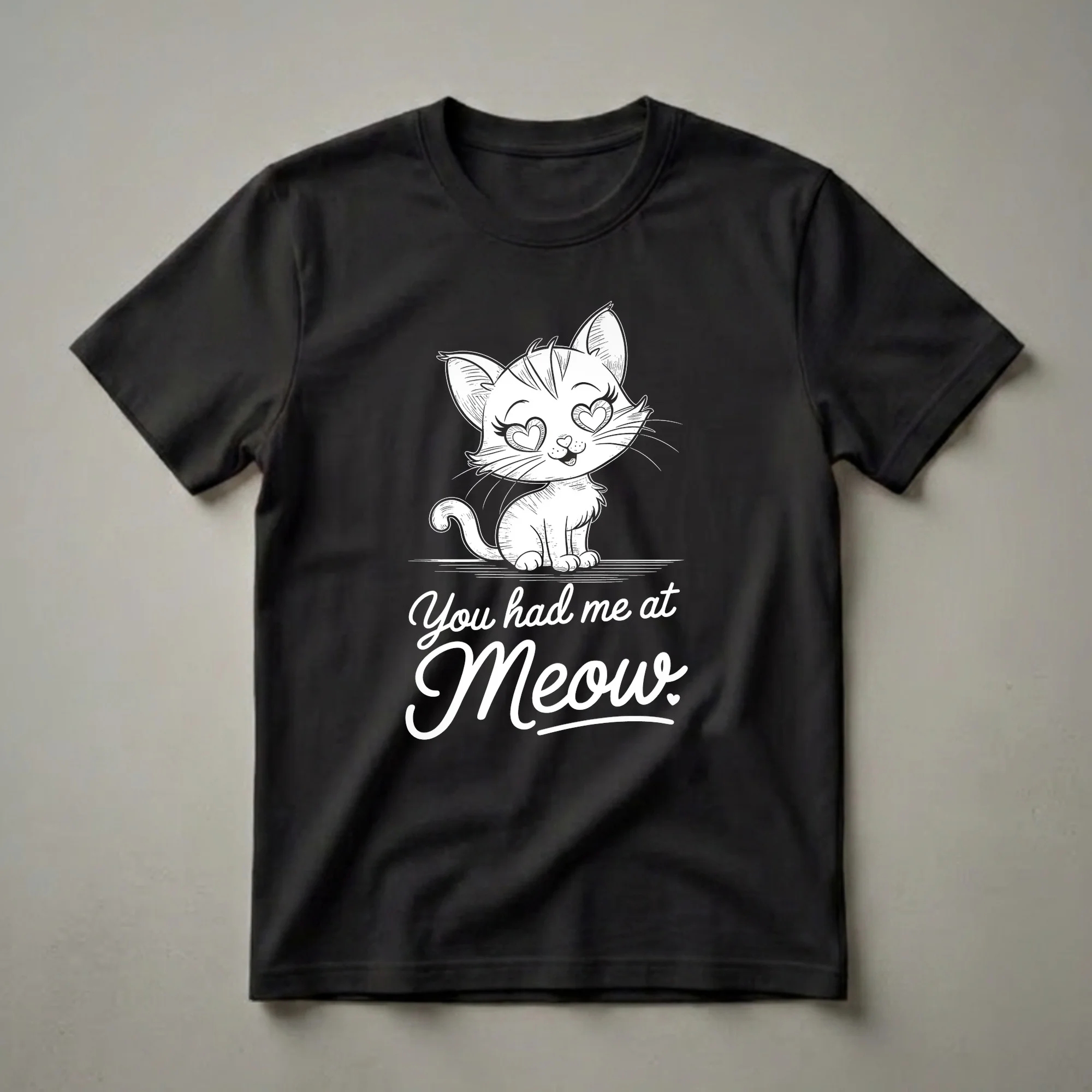 Cat moms and cat dads who can't resist their feline friends will adore this charming graphic tee. The design features a whimsical sketch of a cute cat with heart-shaped eyes, looking lovingly forward. Below the cat, the phrase 'You had me at Meow.' is written in a playful, cursive font, complete with a small heart accent. This eye-catching t-shirt is a delightful way to express your affection for cats. Many cats are known for their independent yet affectionate nature, often forming deep bonds with their human families. This shirt captures that special connection, making it a go-to tee for casual outings, relaxing at home, or attending cat-themed events. It makes a thoughtful gift for any cat lady or gentleman who believes their cat stole their heart from the very first meow. Wear it to your next vet appointment or simply while cuddling with your beloved pet.