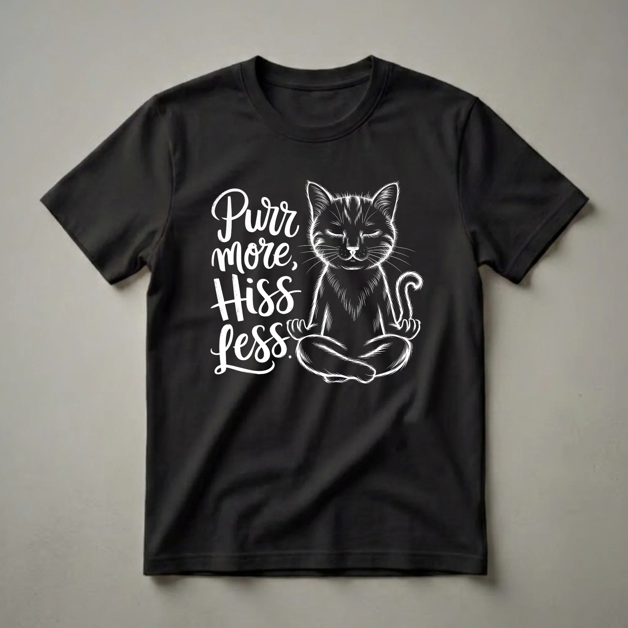 Cat moms and cat dads who appreciate a moment of calm will reach for this unique t-shirt. The design showcases a striking white line art illustration of a contented cat in a meditative pose, complete with closed eyes and hands in a mudra. To the left of the serene feline, the phrase 'Purr more, Hiss less' is written in elegant, flowing white script. This tee is a gentle reminder to approach life with the peaceful demeanor often exhibited by our beloved house cats, who are known for their ability to find comfort and relaxation in quiet moments. Domestic cats, scientifically known as Felis catus, are celebrated for their independent yet affectionate nature, often finding solace in sunbeams or quiet corners. This shirt works well for anyone who understands the calming influence a cat can have on their human companions. It makes a thoughtful gift for the cat lady in your life or for a friend who cherishes their furry family members. Wear this comfortable shirt to your next casual outing, while lounging at home with your pet, or to a cat-themed event.