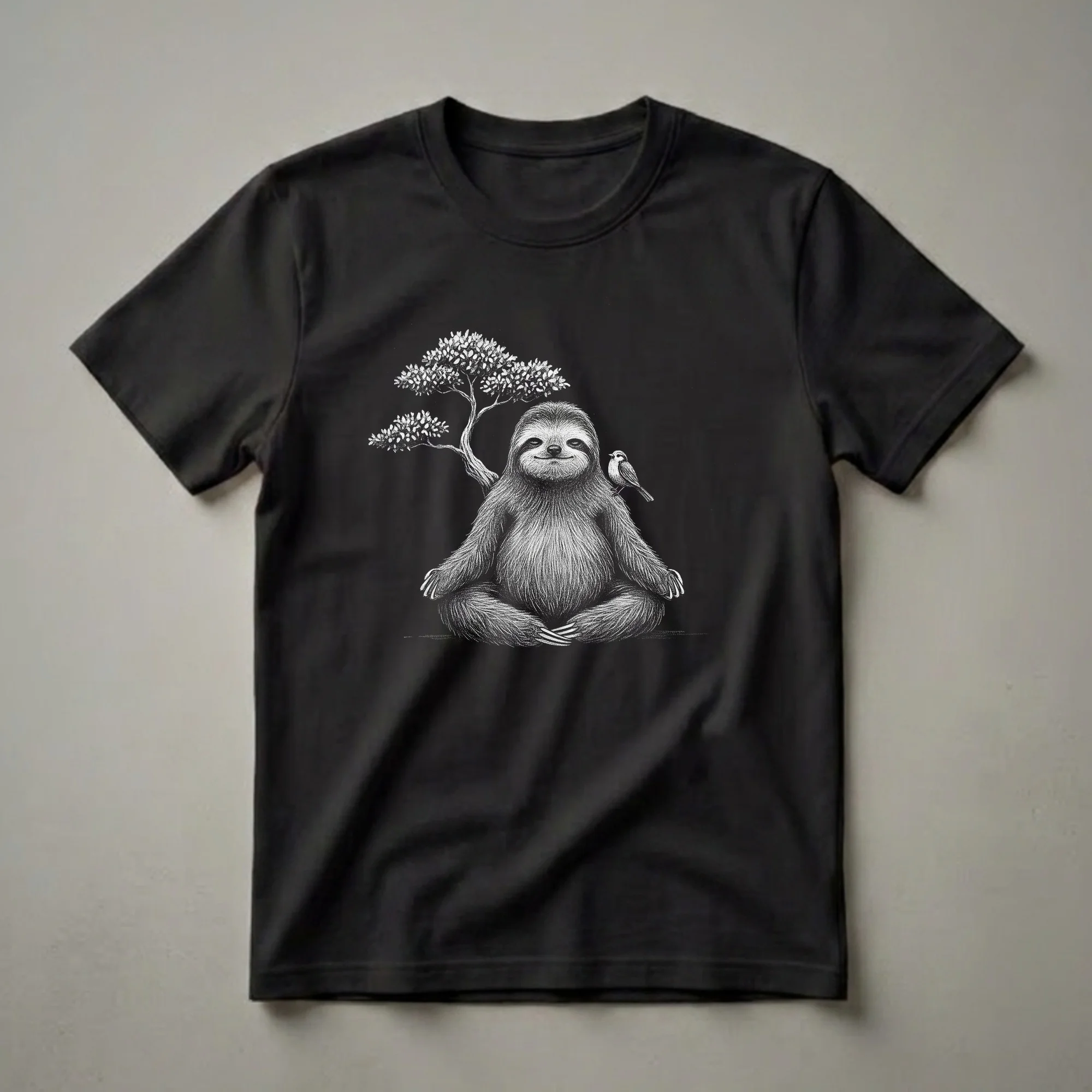 Sloth lovers and yoga practitioners will appreciate this unique graphic tee, showcasing a sloth in a serene meditation pose. The artwork depicts a fluffy sloth seated cross-legged, embodying the calm and mindfulness central to yoga and Buddhist philosophy. Behind the sloth, a stylized bonsai tree adds an element of natural tranquility, while a small bird rests peacefully on the sloth's shoulder, symbolizing companionship and harmony. This t-shirt is a visual representation of finding stillness amidst life's busyness, much like the slow, deliberate movements of a sloth or the focused practice of meditation. It's a perfect way for women who embrace a zen lifestyle to express their passion for both yoga and these gentle creatures. This shirt works well for casual outings, yoga classes, or simply relaxing at home. It makes a thoughtful gift for anyone seeking a moment of calm or a reminder to slow down and appreciate the present. The detailed sketch style adds an artistic touch, making this more than just apparel; it's a statement piece for those who value peace and mindfulness.
